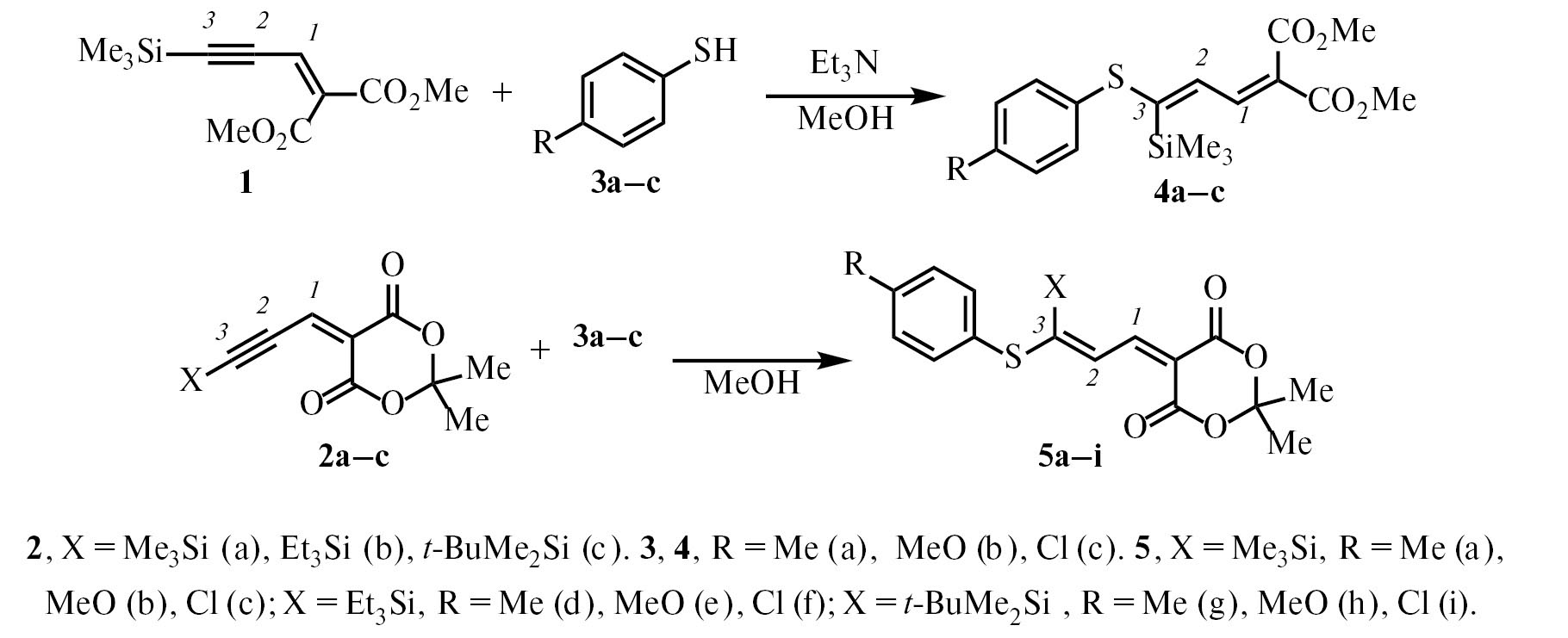 Объекты исследования — активированные енины 1, 2а–с получали конденсацией кремнийсодержащих α-ацетиленовых альдегидов с малоновым эфиром и кислотой Мельдрума соответственно [21, 22]. Согласно шкале Майра, данные С-электрофилы должны существенно различаться по своей активности, поскольку электрофильность арилиденовых производных кислоты Мельдрума приблизительно в 1011 превосходит таковую для арилиденмалонатов [24, 25]. Реакцию этих соединений с пара-замещенными тиофенолами 3а–с проводили в метаноле при комнатной температуре — в условиях, определенных ранее [22, 26]. Действительно, взаимодействие соединений 1 и 2 с тиофенолами 3 происходит в разных условиях: производные кислоты Мельдрума 2а–с реагируют без катализатора [22], тогда как тиилирование малоната 1 происходит лишь в присутствии каталитических количеств Et3N (~10 мол.%). Однако неожиданным оказалось то, что из реакционных смесей тиилирования обоих типов субстратов были выделены только 1,3-диеновые сульфиды 4а–с и 5а–i с выходами 74–78 и 80–94% соответственно (схема 1).