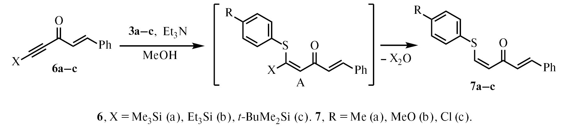 ГХ–МС анализ реакционной смеси тиилирования енинона 6с 4-метокситиофенолом 3b позволил обнаружить в ней незначительное количество соединения с большим временем удерживания, в масс-спектре которого, кроме пика молекулярного иона (m/z 410), присутствуют пики с m/z 395 и 353 (см. экспериментальную часть). Данные фрагментные ионы соответствуют продуктам распада молекулы по группе t-BuMe2Si. Этот факт в совокупности с результатами исследования стереохимии тиилирования субстратов 1, 2 и 6 позволяет заключить, что реакция соединений 6 с тиофенолами идет через стадию образования кремнийсодержащих промежуточных продуктов А. Иными словами, расщепление связи С–Si происходит не в исходных енинонах 6, а в промежуточных продуктах А (схема 2). Прочность связи С–Si в аддуктах 4 и 5, по-видимому, обусловлена мощным электроноакцепторным влиянием 2 группировок С(O)O. Это подтверждается ранее известными результатами [18]: так, метиловый эфир 5-триметилсилилпент-2-ен-4-иновой кислоты, содержащий, как и ениноны 6, одну электроноакцепторную группу, реагирует с MeSH (растворитель — MeOH с добавкой MeONa) при комнатной температуре с полным отщеплением группы Me3Si.