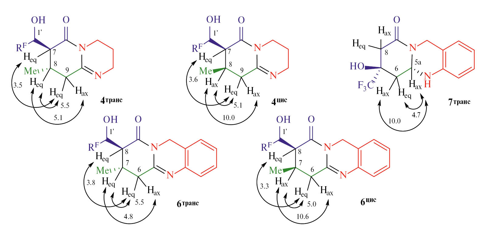 Родственные гетероциклы 4 и 6 содержат при пиридоновом цикле 2 асимметрических центра С7 и С8, поэтому они могут формироваться в виде 4 диастереомерных форм. Однако в каждом случае в исследуемых реакциях образуется по 2 диастереомера. Анализ их спектров ЯМР 1H показал различие в сдвигах и константах спин-спинового взаимодействия (КССВ) диастереотопных протонов H9 и H6 для цис- и транс-диастереомеров 4 и 6, соответственно (таблица). Значения неэквивалентности диастереотопных протонов DAB = dA — dB для гетероциклов 4 и 6, имеющих цис-конфигурацию, лежат в интервале DAB = 0.08–0.14 м.д., тогда как для соединений 4транс и 6транс эти значения имеют бо́льшие величины: DAB = 0.42–0.55 м.д. Геминальные КССВ цис-изомеров 4, 6 имеют величину 2J = 16.3–17.6 Гц, а транс-изомеров 4транс и 6транс _ 2J = 15.2–15.8 Гц. Аналогичные значения неэквивалентности диастереотопных протонов и КССВ ранее нами были выявлены для транс/цис-диастереомеров подобных октагидропиридо[1,2-a]пиридинов и тетрагидропиридо[2,1-b]хиназолинов [11].