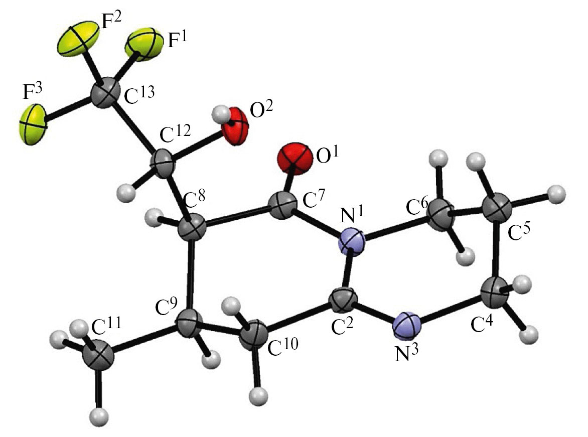 (7S*,8R*)-8-Метил-7-(2,2,2-трифтор1-гидро-ксиэтил)-2,3,4,7,8,9-гексагидро-6H-пиридо[1,2-a]-пиримидин-6-он (4цис). Выход 0.251 г (19%), бесцветный порошок, т.пл. 204–207°С. ИК спектр, ν, см–1: 2966–2858 (C–H), 2656–2573 (O–H), 1694 (C=O), 1642 (C=N), 1170–1098 (C–F). Спектр ЯМР 1H, δ, м.д.: 0.95 д (3H, Me, J 7.0 Гц), 1.68–1.73 м (2H, H3), 2.24–2.32 м (1H, H8), 2.46 д.д.т (1H, H9B, J 16.3, 10.0, 1.6 Гц, перекрывается ДМСО), 2.53 д.д.д (1H, H9A, J 16.3, 5.1, 0.8 Гц, перекрывается ДМСО), 2.83 т (1H, H7, J 3.6 Гц), 3.23–3.34 м (2H, H4, перекрывается H2O), 3.48–3.63 м (2H, H2), 4.24–4.31 м (1Н, H1’), 6.51 д (1Н, OH, J 6.8 Гц). Спектр ЯМР 13C, δ, м.д.: 15.8 (Me), 20.8 (C3), 26.9 (C8), 36.5 (C9), 39.2 (C7, перекрывается ДМСО), 43.9 (C4), 47.0 (C2), 66.4 к (C1’, J 30.4 Гц), 125.3 к (CF3, J 283.6 Гц), 149.5 (C9a), 168.1 (C6). Спектр ЯМР 19F, δ, м.д.: 87.29 д (CF3, J 8.4 Гц). Масс-спектр: найдено m/z 265.1158 [M + H]+; вычислено для C11H16F3N2O2 m/z 265.1159. Найдено, %: C 49.91; H 5.54; N 10.54. C11H15F3N2O2. Вычислено, %: C 50.00; H 5.72; N 10.60.