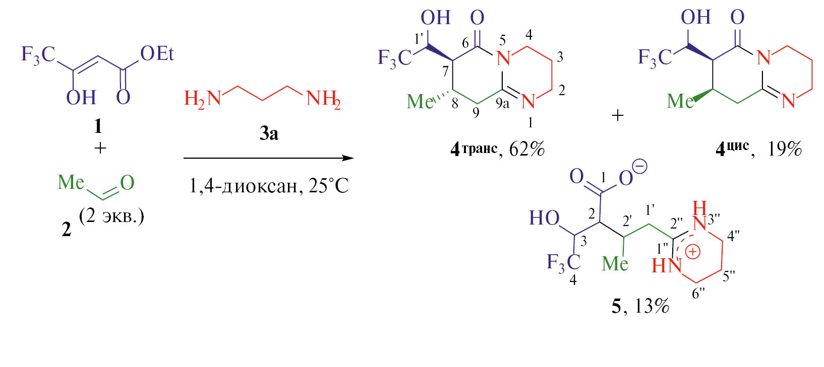 Нами найдено, что эфир 1 реагирует с уксусным альдегидом 2, взятым в двойном избытке, и 1,3-диаминопропаном 3a в 1,4-диоксане при комнатной температуре с формированием продукта четырехкомпонентного взаимодействия по метиленэтоксикарбонильному фрагменту гексагидропиридо[1,2-a]пиримидин-6-она 4, содержащего гидрокситрифторэтильную группу, в виде смеси цис- и транс-диастереомеров (схема 1), в которой преобладает транс-диастереомер 4транс. Кроме того, в небольшом количестве из реакционной массы была выделена внутренняя соль тетрагидропиримидина 5, содержащая открытоцепной кислотный фрагмент.