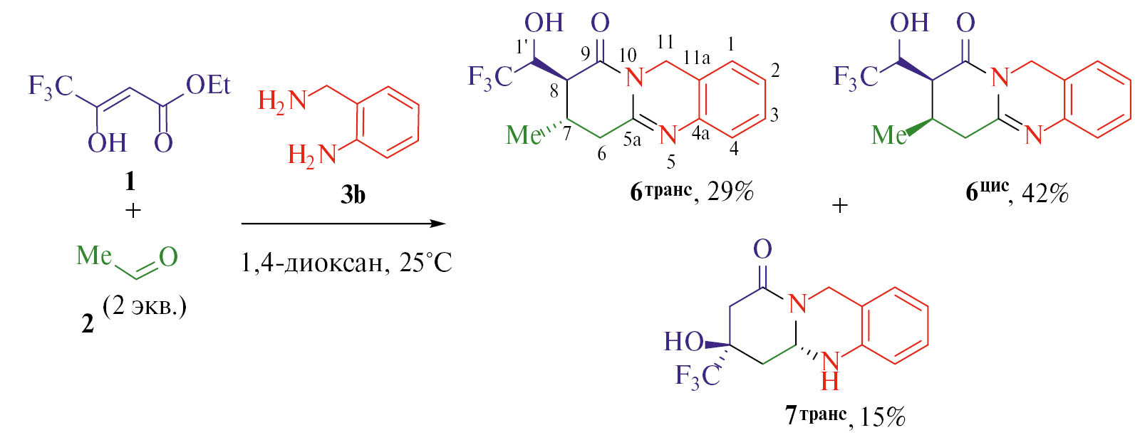 В ходе трёхкомпонентной реакции реализуется конкурентный процесс формирования пиридохиназолинона 7 (схема 3, путь Б). В этом случае ацетальдегид 2 конденсируется с 2-аминометиланилином 3b, образуя последовательно енамин B1 и хинозалин B2, метильная группа которого присоединяется к трифторацетильному заместителю эфира 1, давая интермедиат В3. Последний циклизуется с участием этоксикарбонильного заместителя и аминогруппы гетерокольца в соединение 7. Аналогичный путь наблюдали при взаимодействии с этилендиамином [12], однако с 1,3-диаминопропаном 3a реакция в таком направлении не идет, что зафиксировано при анализе реакционной массы методом ГХ-МС.