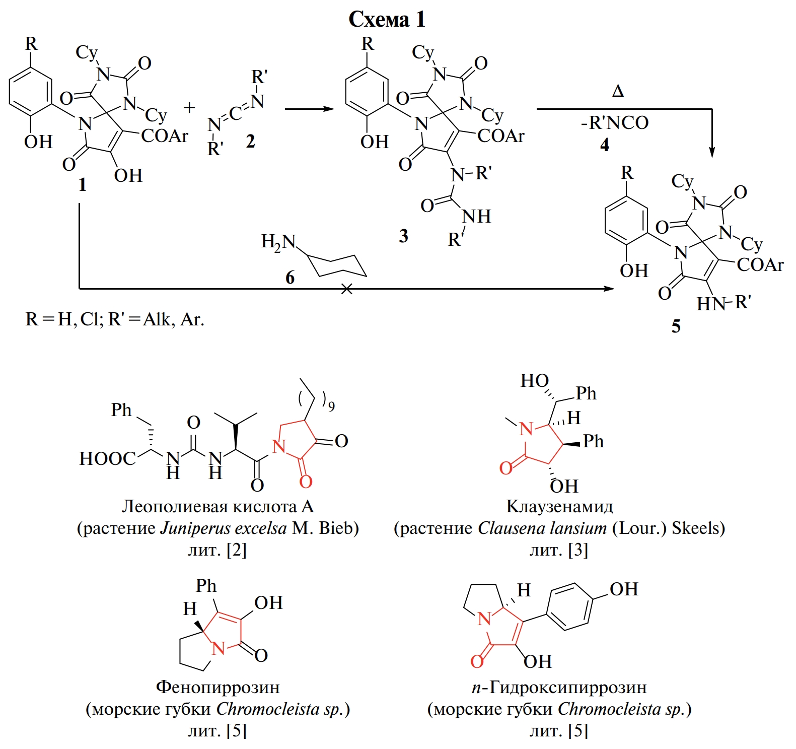 Ранее нами был разработан подход к получению аминированных спиро[имидазол-5,2′-пирролов] 5 (схема 1) [17], эффективный в тех случаях, когда аминирование 3-гидрокси-1,5-дигидро-2Н-пиррол-2-онов 1 классическим методом (их реакцией с аминами 6) невозможно (схема 1). Данный подход [17] включает 2 этапа. Первый этап заключается в замещении OH-группы в положении С3 пиррольного фрагмента соединений 1 на уреидную группу реакцией с карбодиимидами 2, в результате чего образуются уреиды 3. Второй этап — термолиз уреидов 3 с образованием изоцианатов 4 и целевых 3-аминозамещенных пиррол-2-онов 5.