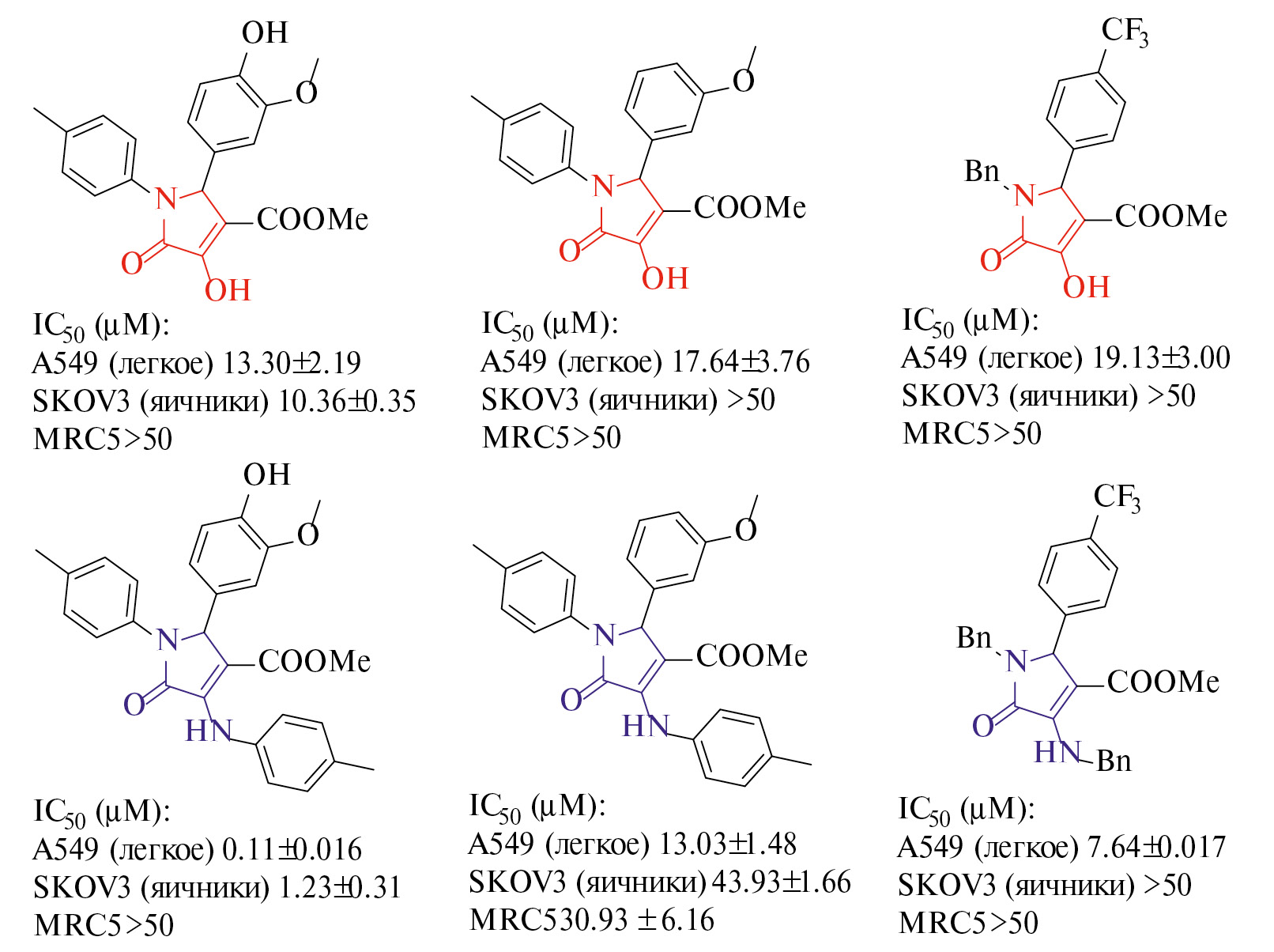Рис. 3. Антипролиферативная активность некоторых 3-гидрокси- и 3-амино-1,5-дигидро-2Н-пиррол-2-онов [12]