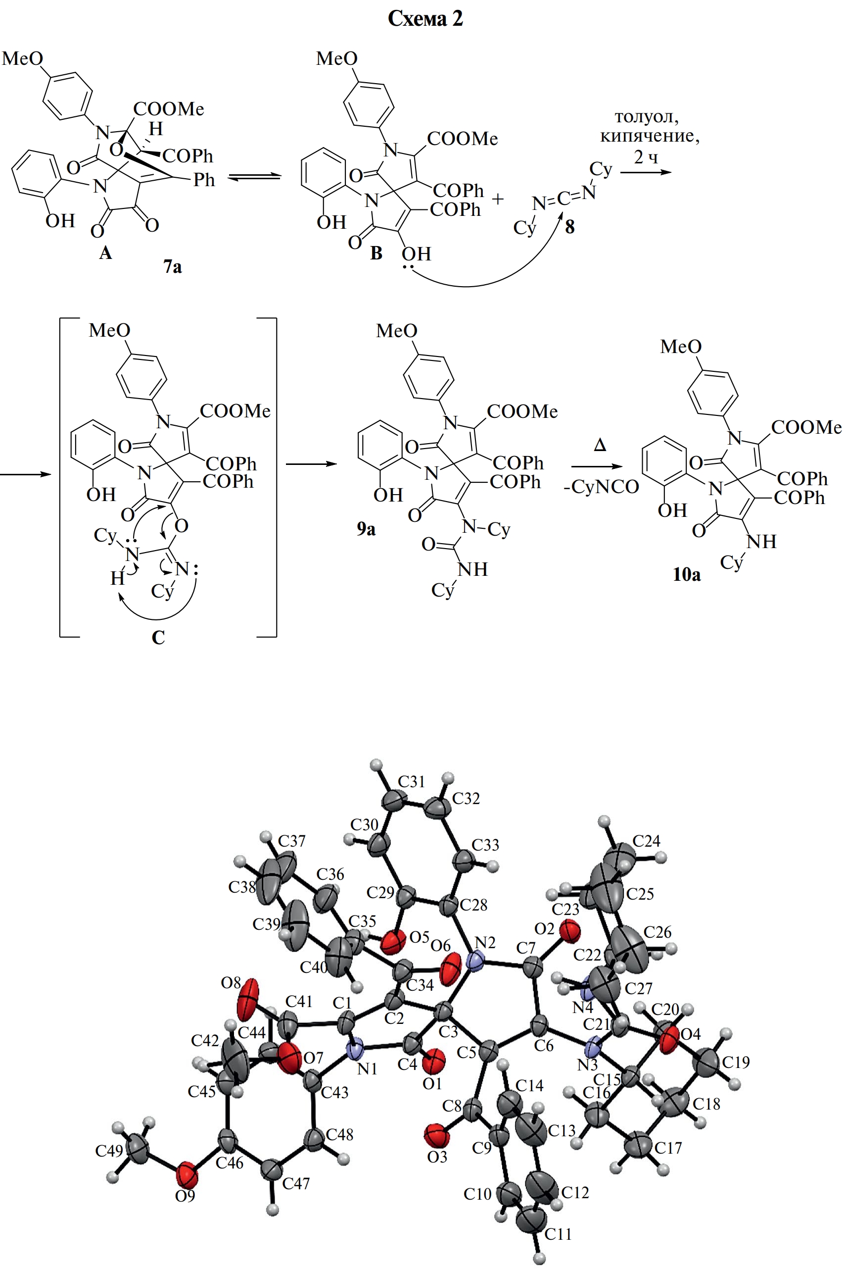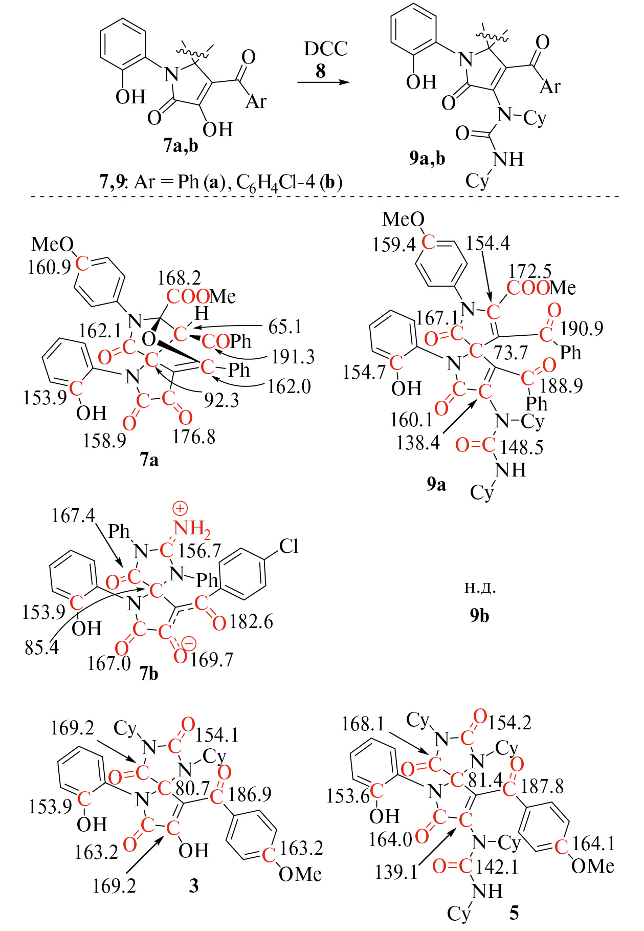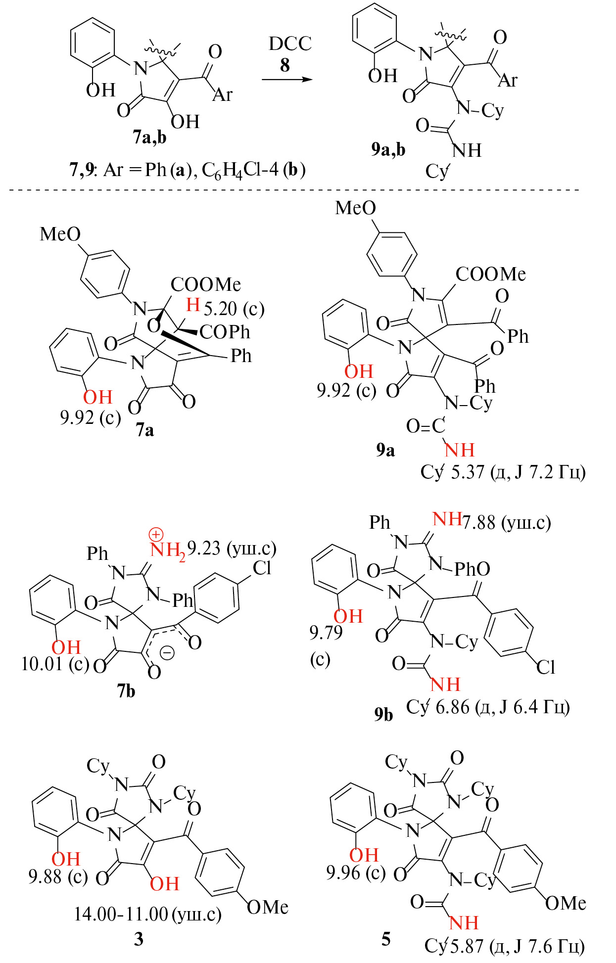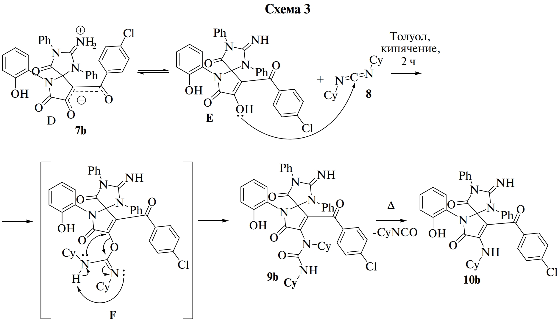 Взаимодействие соединения 7b с дициклогексилкарбодиимидом 8 приводит к образованию уреидоспироцикла 9b (схема 3). Примечательно, что исходное соединение 7b существует в форме иминиевой соли D [19], находящейся, по-видимому, в равновесии с 3-гидроксипиррол-2-оновой формой E, которая и вступает в реакцию с карбодиимидом 2 с образованием соединения 9b.