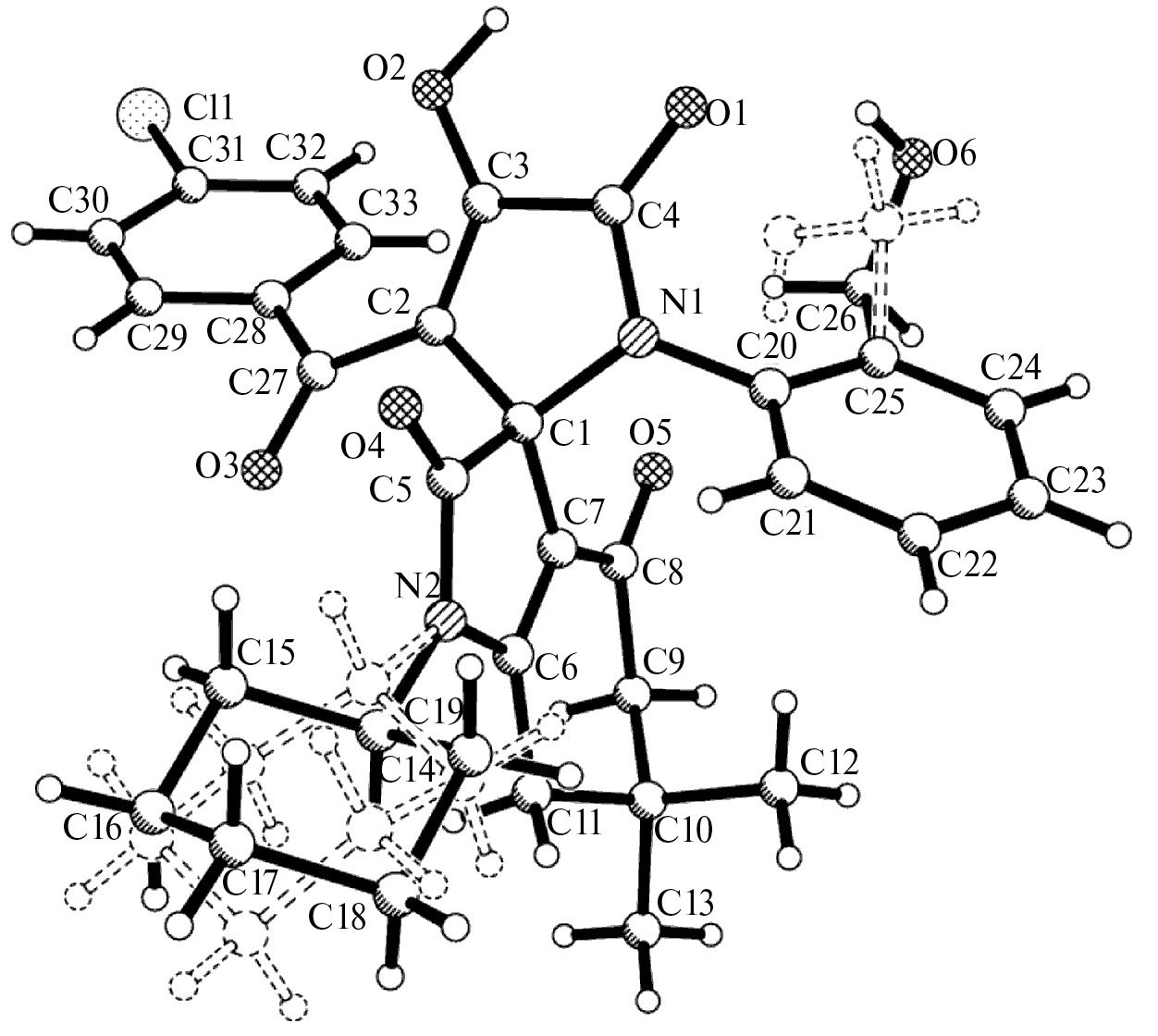 При взаимодействии 3-ароилпирроло[1,2-а][4, 1]бензоксазепин-1,2,4-трионов 1a,b с 3-циклогексиламино-5,5-диметилциклогекс-2-ен-1-оном происходит образование 3′-(4-ароил)-4′-гидрокси-1′-(2-(гидроксиметил)фенил)-6,6-диметил-1-циклогексил-6,7-дигидроспиро[индол-3,2′-пиррол]-2,4,5′(1H,1′H,5H)-трионов 2a,b (схема). Структура соединений 2 подтверждена методом рентгеноструктурного анализа (РСА) на примере соединения 2b (рисунок).