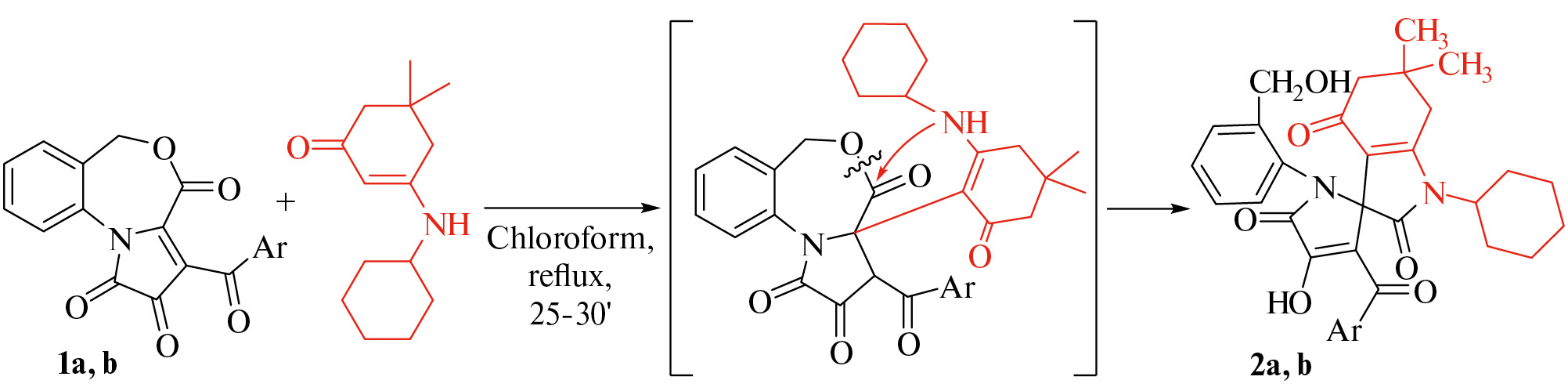 Соединения 2 образуются вследствие последовательной нуклеофильной атаки β-CH и NH группами енаминофрагмента 3-циклогексиламино-5,5-диметилциклогекс-2-ен-1-она атомов С3а и С4 пирролобензоксазепинтрионов 1 и раскрытия оксазепинового цикла по связи С4–О5. Ранее подобная схема взаимодействия описана для реакций пирролобензоксазинтрионов с енаминокетонами [2].