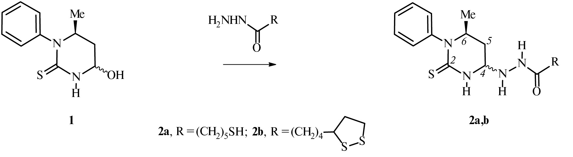 Мы обнаружили, что взаимодействие 4-гидрокси-1-фенил-6-метилтетрагидропиримидин-2(1Н)-тиона 1 с гидразидами 6-меркаптогексановой и липоевой (тиоктовой) кислот проходит после непродолжительного кипячения эквимолярных количеств исходных соединений в MeOH в присутствии каталитических количеств АсОН и приводит к образованию целевых продуктов 2а,b с выходами 60–75% (схема).