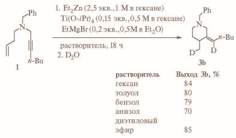 При использовании Ti(O-iPr)4 и Et2Zn в растворе гексана и EtMgBr в растворе диэтилового эфира, а также хлористого метилена в качестве растворителя реакция, очевидно, происходит не в чистом хлористом метиле, а в смеси растворителей, состоящей из хлористого метилена, гексана и диэтилового эфира в соотношении 8 : 6, 7 : 1 (схема 2). На основании проведенного эксперимента можно предположить, что карбоцинкирование енина 1 должно осуществляться также эффективно и в растворе гексана или диэтилового эфира. Действительно, циклизация 1 проходила одинаково эффективно при замене хлористого метилена на гексан или диэтиловый эфир с образованием дидейтерированного производного метиленпиперидина 3b с соответствующими выходами 84 и 85% (схема 4).