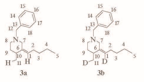 Нами установлено, что реакция N-бензил-N-(бут-3-ен-1-ил)гепт-2-ин-1-амина (1) с 2.5 экв. Et2Zn (1 М раствор в гексане) в присутствии 15 мол. % Ti(O-iPr)4 (0.5 M в гексане) и 20 мол. % EtMgBr (0.5 M в Et2O) в растворе хлористого метилена приводит к регио- и стереоселективному образованию (Z)-1-бензил-4-метил-3-пентилиденпиперидина 3a с выходом 89% (схема 2). Структура образующегося замещенного пиперидина также установлена с помощью 1D- и 2D ЯМР спектроскопии продукта дейтеролиза 3b.