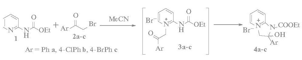 В ходе изучения реакции кватернизации 2-этоксикарбониламинопиридина (1) замещенными фенацилбромидами 2a–c обнаружено неожиданное образование с выходами 54–65% производных 2-арил-2-гидрокси-2,3-дигидро-1Н-имидазо[1,2-а]пиридиния бромидов 4a–c (схема 1).