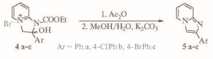 2-Арил-1-(этоксикарбонил)-2-гидрокси-2,3-дигидро-1Н-имидазо[1,2-а]пиридиния бромиды 4a–c легко подвергаются ароматизации. Так, нагревание данных соединений в уксусном ангидриде с последующей обработкой раствором поташа (метод А) дает с выходами 71–87% 2-арилилимидазо[1,2-а]пиридины 5a–c (схема 2) [6].