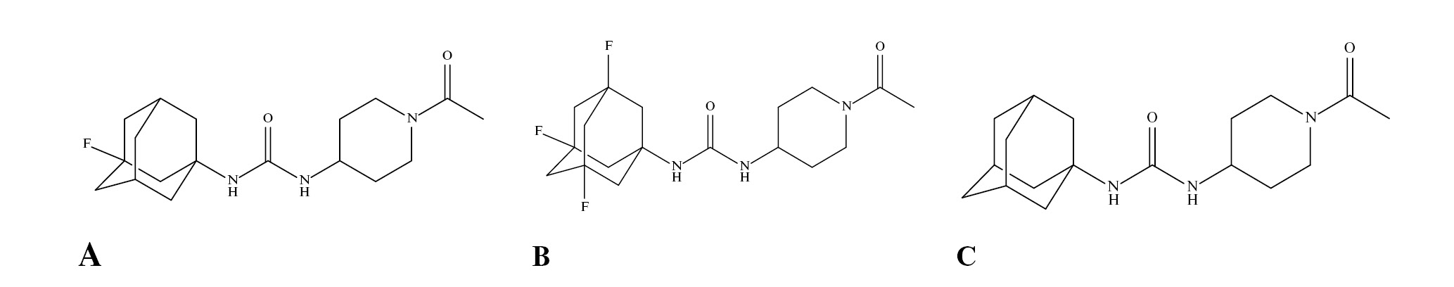 Рис. 1. 1-(1-Ацетилпиперидин-4-ил)-3-адамантан-1-илмочевина (A) и ее фторированные аналоги (B, C) – соединения – кандидаты на клинические исследования