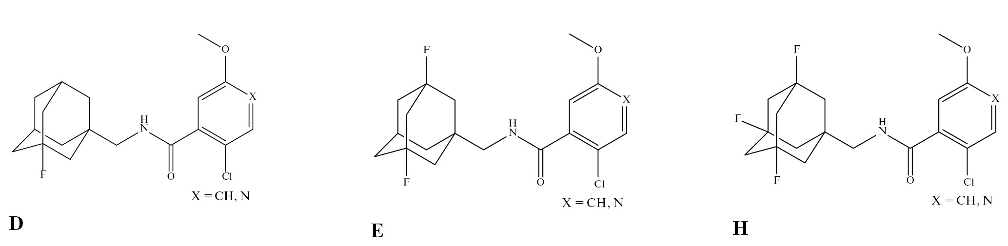 В другом исследовании, посвященном разработке антагонистов рецептора P2X7 на основе адамантилсодержащих бензамидов (рис. 2), проводилось всестороннее сравнение свойств соединений при последовательной замене всех атомов водорода в узловых положениях адамантильного фрагмента на атомы фтора (рис. 2, D, E, Н) [9]. Установлено, что соединение, содержащее 3,5,7-триметиладамантильный фрагмент (рис. 2, Н), в 4-8 раз более стабильно в различных органах и тканях и в 5-8 раз более устойчиво к действию цитохромов CYP1A2, CYP2C9 и CYP2C19, чем незамещенный аналог. Однако, как и в случае ингибиторов hsEH, наблюдалось снижение активности более чем в 3 раза при переходе от незамещенного адамантильного заместителя к 3,5,7-трифторадамантильному (Н).