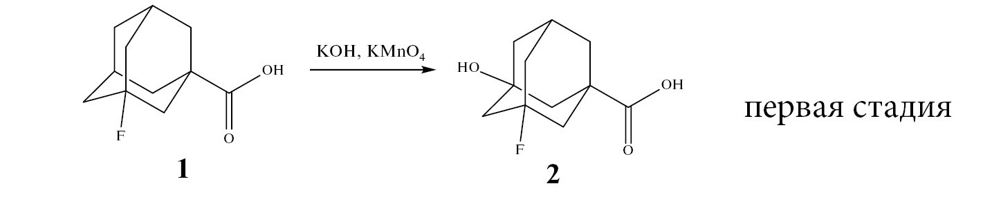 На первой стадии 3-фтор(адамантан-1-ил)карбоновую кислоту (1) окисляли перманганатом калия в щелочной среде до [3-фтор-5-гидрокси(адамантан-1-ил)]карбоновой кислоты (2) (схема 1). Хотя выход на данной стадии составляет 45%, нам удалось разделить продукт реакции от примеси исходной кислоты 1. Метод разделения основан на различной растворимости соединений 1 и 2 в системе этилацетат–метанол (20 : 1). Продукт реакции выпадал в осадок при концентрировании раствора и затем доочищался перекристаллизацией, а оставшуюся в растворе кислоту 1 затем повторно вводили в реакцию окисления.