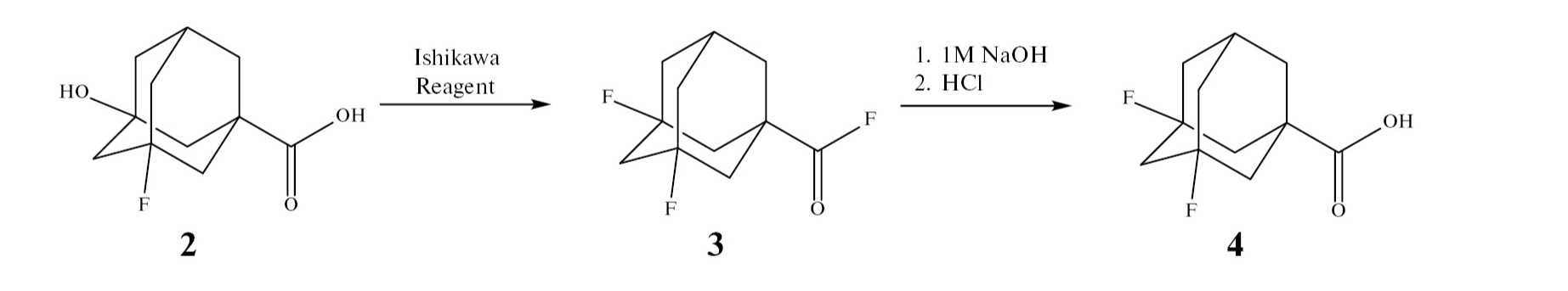 Полученную кислоту 2 действием реагента Исикавы (смесь N,N-диэтил-(1,1,2,3,3,3-гексафлорпропил)амина и N,N-диэтил-(E)-пентафторпропенамина) переводили в фторангидрид 3,5-дифтор(адамантан-1-ил)карбоновой кислоты (3), (схема 2), который без выделения и очистки гидролизовали до 3,5-дифтор(адамантан-1-ил)карбоновой кислоты (4).