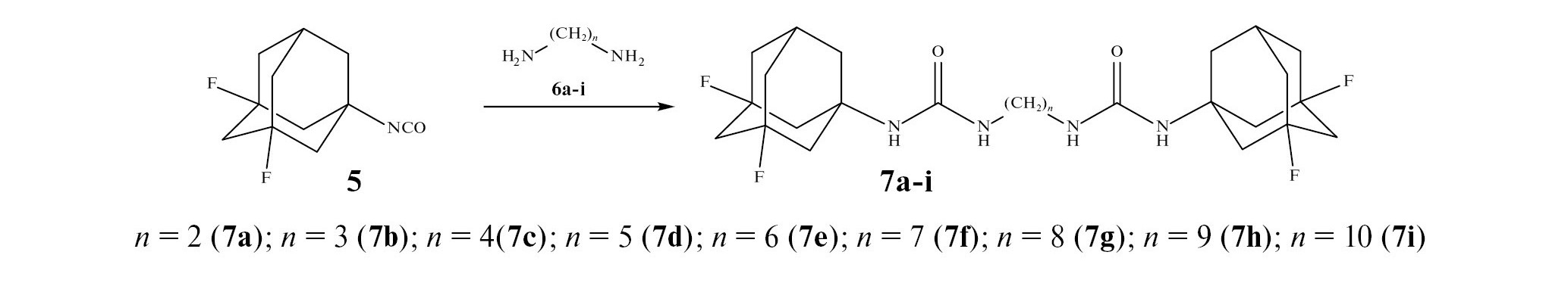 Структуру полученных соединений подтверждали методами ЯМР-спектроскопии 1H, 13C, 19F, и масс-спектрометрии. В спектрах ЯМР 1H соединений 7b–i химический сдвиг протонов NH, расположенных ближе к адамантильному фрагменту, находится в области 5.91 ± 0.1 м.д. и смещается в более сильное поле с увеличением спейсера между мочевинными группами. Сигнал протонов NH, связанных с метиленовыми мостиками -(CH2)n- между мочевинными группами, также уходит в более сильное поле по мере увеличения n (от 5.76 м.д. для n = 2 до 5.72 м.д. для n = 10).
