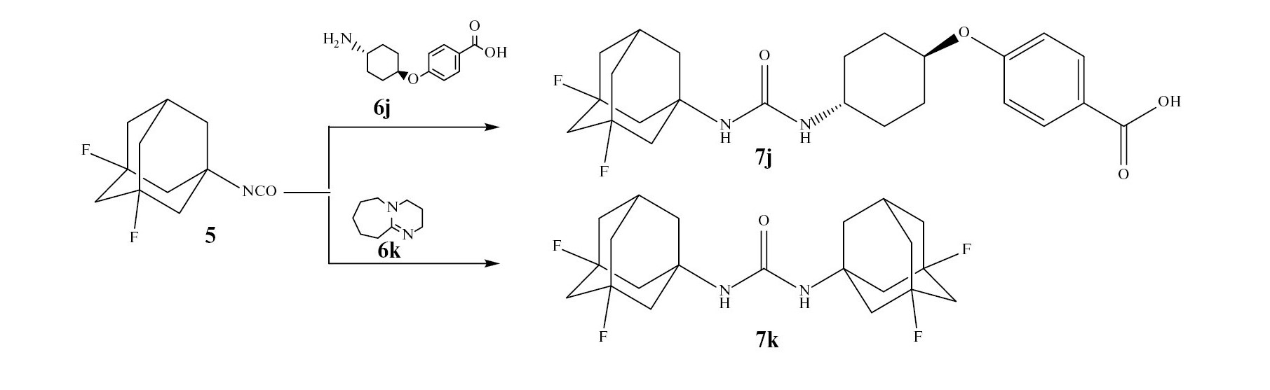 Для синтеза 1,3-дизамещенных димочевин 7a–i из изоцианата 5 были выбраны алифатические диамины 6a–i (схема 4), а также амин, на основе которого ранее получены наиболее активные ингибиторы растворимой эпоксидгидролазы человека [4] – транс-4-амино-(циклогексилокси)бензойная кислота (6j, схема 5). Ингибирующая активность димочевин в отношении sEH неоднократно подтверждалась ранее [6].