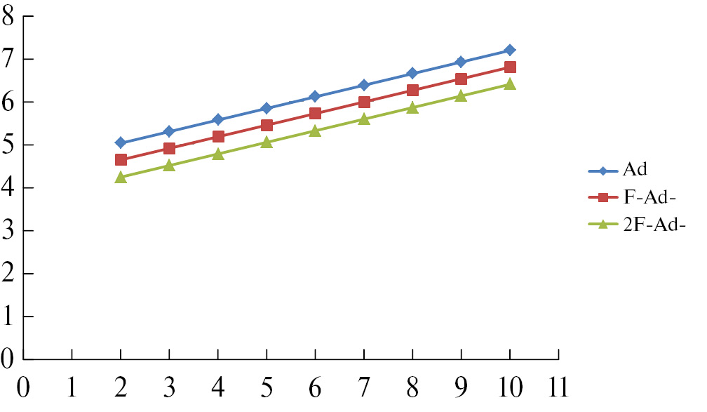 Рис. 3. Зависимость logP (ось Y) от числа метиленовых мостиков n (ось X) в димочевинах при различном содержании атомов фтора в адамантильном заместителе