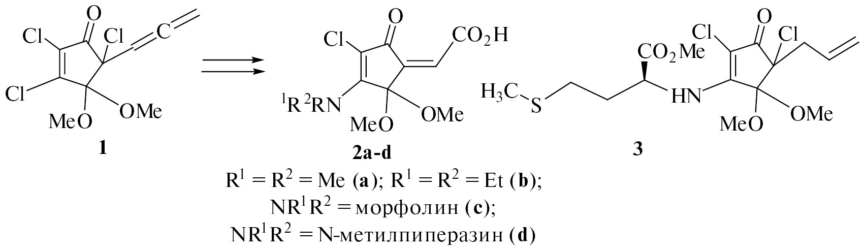 Ранее нами на основе 3-аминопроизводных 5-алленилтрихлорциклопентенона 1 [2] были синтезированы соединения 2a–d (схема 1), среди которых кислота 2а проявила высокую активность в отношении вируса табачной мозаики [3, 4]. Кроме того, соединение 3, полученное взаимодействием 5-аллил-2,3,5-трихлорциклопентенона с метиловым эфиром L-метионина [5, 6], проявило активность в отношении вируса H1N1, сравнимую с активностью арбидола при меньшей токсичности [7].
