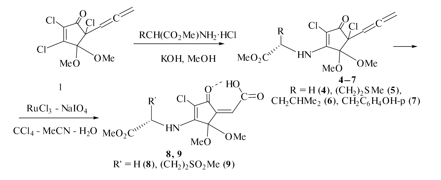В данной работе нами осуществлен синтез новых производных хлорциклопентенонов, сочетающих в своей структуре аминокислотный и карбоксиметилиденовые фрагменты. Для осуществления этой задачи вначале были получены соединения 4–7 взаимодействием трихлорциклопентенона 1 с гидрохлоридами метиловых эфиров глицина, L-метионина, L-лейцина и L-тирозина в разработанных ранее условиях [5, 6] в метаноле в присутствии избытка K2CO3 или КОН (схема 2).