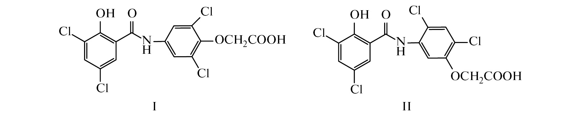 Галогенированные салициланилиды обладают антигельминтной активностью, способностью блокировать ферменты, ответственные за развитие опухолей [1–3] и воспалительных процессов [4], эффективны в отношении микобактерий туберкулеза [5], бактерий ботулизма и различных вирусов [6–9]. Большинство соединений ряда салициланилидов мало растворимы в воде, что может являться причиной их малой биодоступности и эффективности [10]. Ранее [11] нами были синтезированы 2 изомерных анилида 3,5-дихлорсалициловой кислоты, содержащих карбоксиметоксигруппу в анилиновом фрагменте: [2,4-дихлор-5-(3,5-дихлор-2-гидроксибензамидо)фенокси]уксусная кислота (I) и [2,6-дихлор-4-(3,5-дихлор-2-гидроксибензамидо)фенокси]уксусная кислота (II) (рисунок), которые предполагается использовать в виде водорастворимых солей.