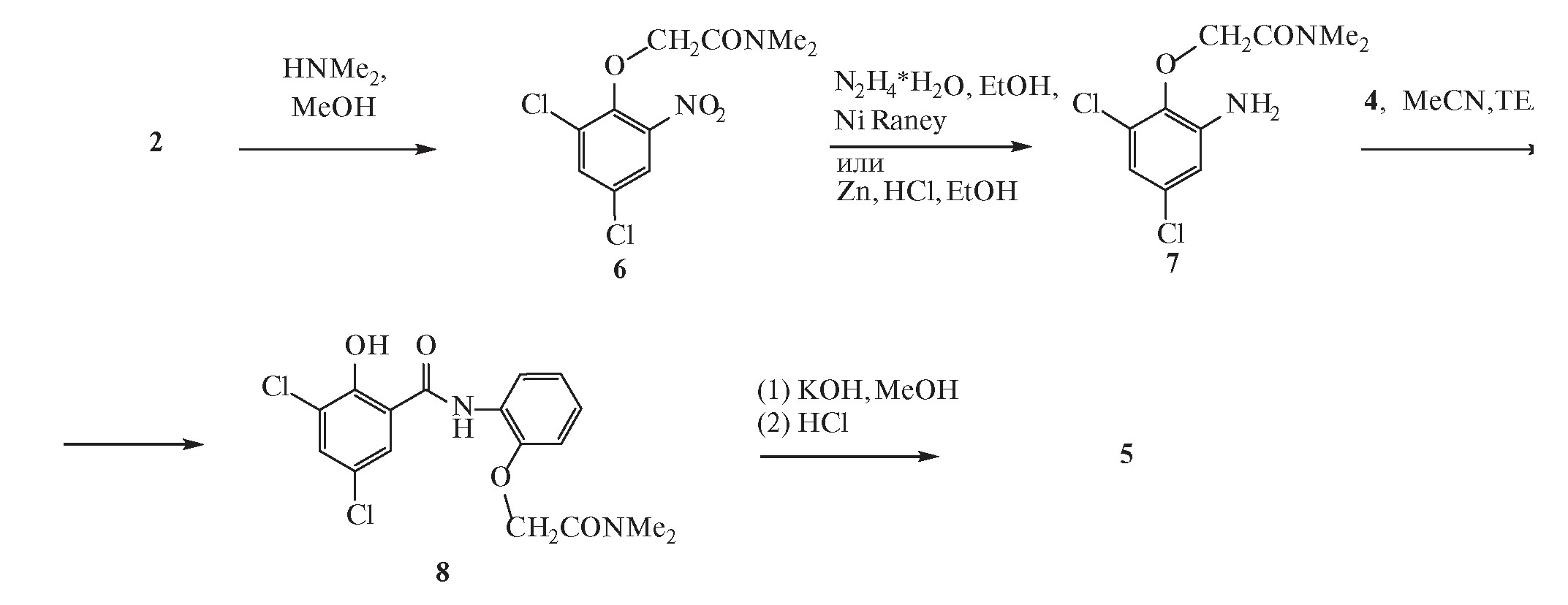 Согласно литературным данным, N,N-диалкиламиды 2-аминофеноксиуксусной кислоты более устойчивы в реакции внутримолекулярного самоацилирования [15, 16]. Поэтому для повышения выхода целевого салициланилида 5 мы предварительно защищали карбоксильную группу нитрокислоты 3, переводя ее в N,N-диметиламид. Для этого использовали второй путь синтеза (схема 2), в котором метиловый эфир 2 обрабатывали метанольным раствором диметиламина при комнатной температуре, и после отгонки растворителя и очистки из водного этанола нитро-N,N-диметиламид 6 получали с выходом 85%. Далее проводили восстановление нитрогруппы соединения 6 гидразингидратом в этаноле с использованием никеля Ренея. Полное восстановление до амина происходило при температуре не менее 50–55˚С, реакция сопровождалась заметной внутримолекулярной циклизацией амино-N,N-диметиламида 7 в побочный продукт 6,8-дихлор-2Н-1,4-бензоксазин-3(4Н)-он, и поэтому выход амино-N,N-диметиламида 7 составил только 58%. Более подходящим методом оказалось восстановление цинковой пылью в смеси соляной кислоты и этанола, которое легко протекает при комнатной температуре, и в результате амино-N,N-диметиламид 7 был получен с более высоким выходом 91%. Амино-N,N-диметиламид 7 ацилировали 2-гидрокси-3,5-дихлорбензоилхлоридом (4) в среде ацетонитрила с использованием в качестве акцептора протонов триэтиламина. Выход салициланилида 8 составил 84%. Соединение 8 является N,N-диметиламидом целевого салициланилида 5.