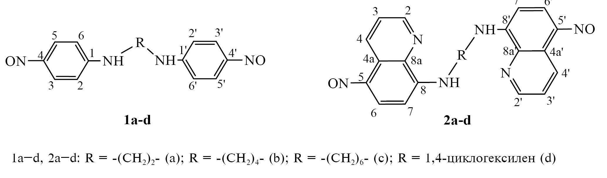 Объединение в структуре одной молекулы 2 С-нитрозоанилиновых фрагментов может привести к получению соединений с полифункциональными свойствами в полимерных композициях. Вышеуказанным структурным критериям отвечают N,N'-бис(4-нитрозофенил)алкан(циклоалкан)диамины 1a–d и N,N'-бис(5-нитрозохинолин-8-ил)алкан(циклоалкан)диамины 2a–d (рис. 1). Недавно показано, что N1,N2-бис(4-нитрозофенил)этан-1,2-диамин 1a (рис. 1) и N1,N6-бис(5-нитрозохинолин-8-ил)гексан-1,6-диамин 2c (схема 1) проявляют свойства эффективных структурирующих агентов и одновременно стабилизаторов аминного типа в полимерных композициях на основе непредельных каучуков [5–7]. Кроме того, соединение 2c является модификатором адгезии резин к металлу [7] за счет образования хинолин-8-аминовыми группами устойчивых хелатных комплексов [8, 9].