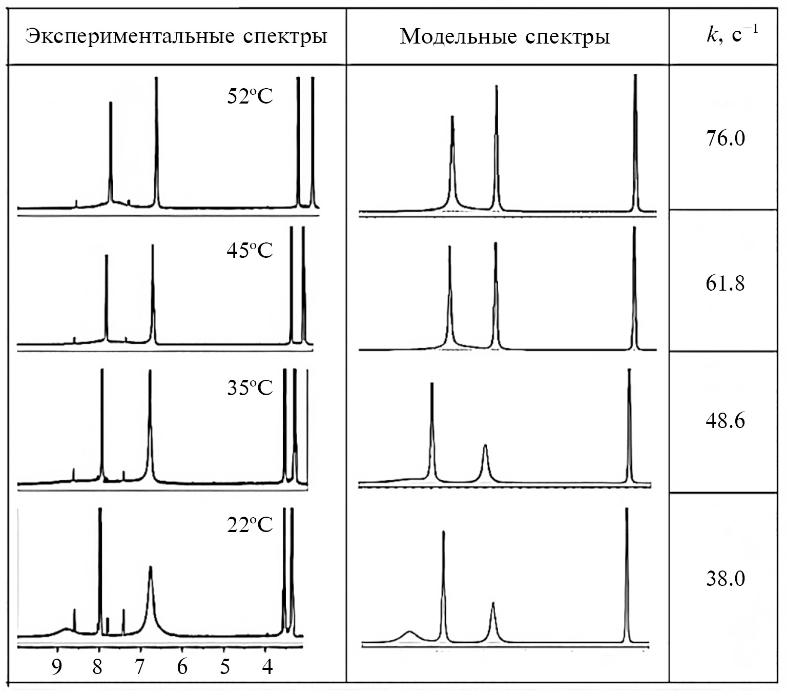 Компьютерное моделирование спектров ЯМР 1H и расчет констант скорости обмена выполнены с использованием пакета программного обеспечения gNMR 5.0.6.0. [20]. Вначале для спектра, в отсутствие обмена, теоретически моделировали формы линий эталонных сигналов протонов. Затем в результате программного изменения химических сдвигов, ширины сигналов на полувысоте и КССВ (если есть) формы линий были оптимизированы с использованием метода наименьших квадратов с экспериментально наблюдаемыми формами линий в файлах с расширением spg. Спектры, рассчитанные с фиксированной разностью между химическими сдвигами эталонных сигналов, фиксированной шириной на полувысоте и константами связи, коррелировали с серией экспериментальных температурно-зависимых спектров, полученных при изменении константы скорости обмена. В результате были определены константы скорости для каждого спектра при соответствующей температуре (рисунок).