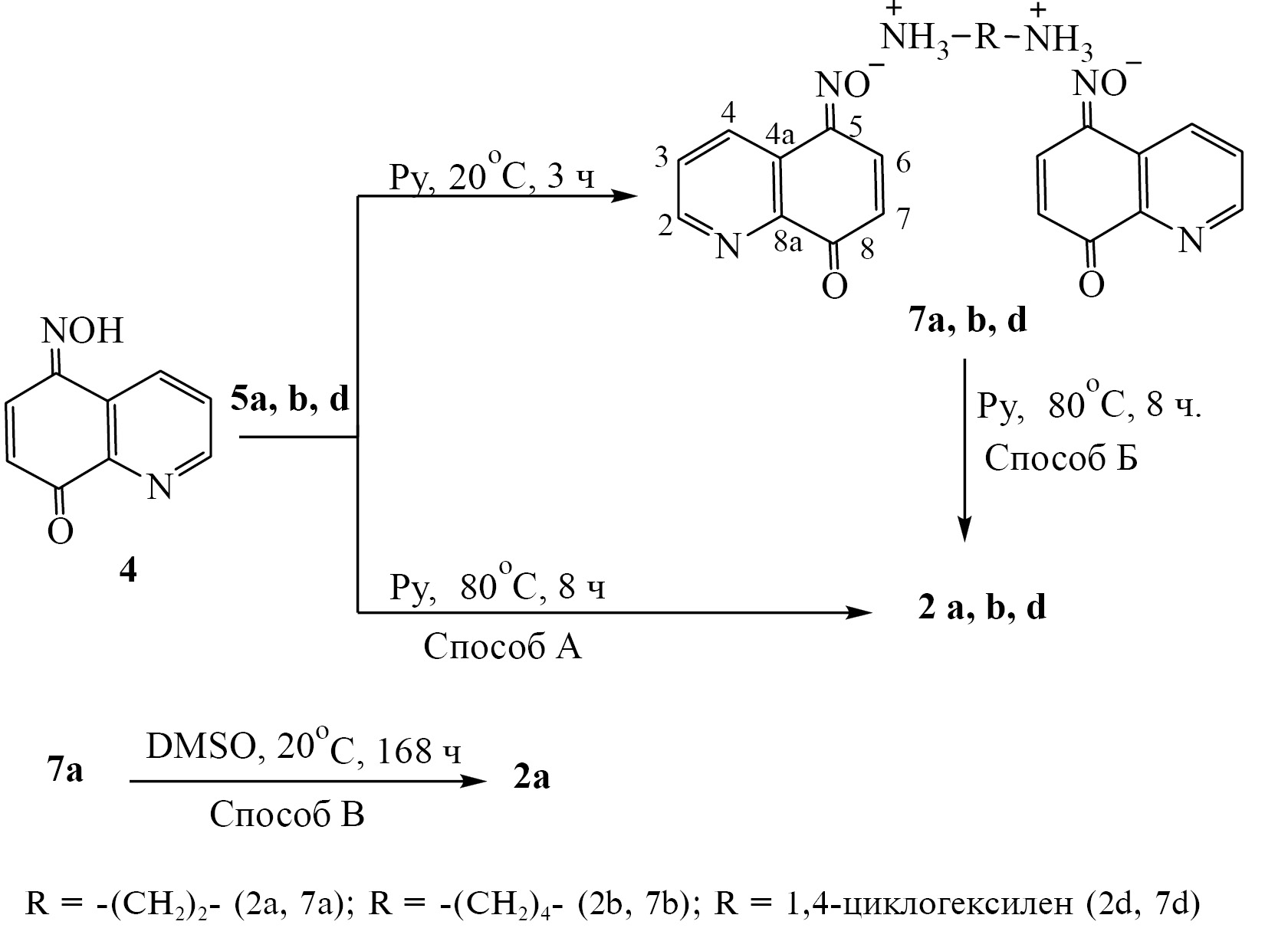 При замене пиридина на ДМСО, в котором соли 6b, d и 7а, b, d хорошо растворимы, соль 7а переходит в продукт аминирования 2а при 20–25°C в течение 168 ч с выходом 70% (схема 2, способ В). В случае солей 6b, d и 7b, d превращение в соответствующие диамины 1b, d и 2a, b, d в ДМСО происходит только при нагревании, но препаративного значения этот способ не имеет.