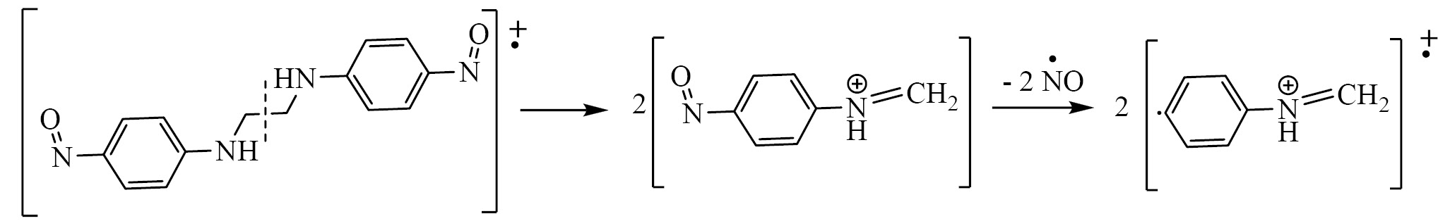 В масс-спектре соединения 1а присутствует пик молекулярного иона 270 (22.8%), соответствующий расчетному. Максимальную интенсивность (100%) имеет сигнал фрагментного иона [С6Н4NH=CH2]·+ m/z 105, который образуется при характерном для алкилариламинов разрыве алифатической С–С связи [13] и выбросе группы NO (схема 3).