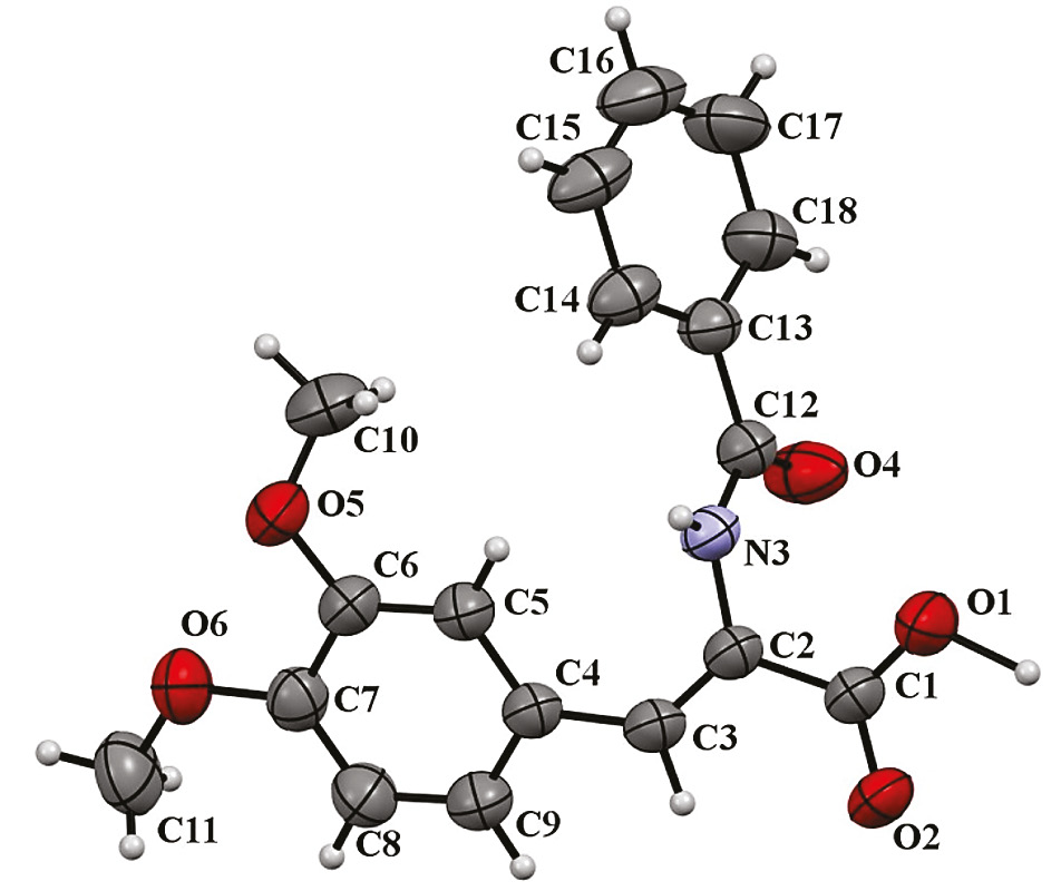 (Z)-2-Бензамидо-3-(3,4-диметоксифенил)акриловая кислота (Z-3). Выход 0.72 г, 68%. Бесцветные кристаллы, т.пл. 198–200°С (из AcOH – H2O 5:1) (196–198°С [20]). ИК-спектр, ν, см–1: 3517 (OH), 3448 (NH), 3057 (CHsp2), 3010 (ArH), 2840 (CH3). Спектр ЯМР 1Н (ДМСО-d6), δ, м.д.: 3.59 с (3H, 3'-OCH3), 3.76 с (3H, 4'-OCH3), 6.98 д (1H, H-5', J 8.5 Гц), 7.27 д.д (1H, H-6', J 8.5, 1.9 Гц), 7.36 д (1H, H-2', J 1.9 Гц), 7.48 с (1H, H-3), 7.53 т (2H, Hm, J 7.5 Гц), 7.60 т (1H, Hp, J 7.3 Гц), 8.03 м (2H, Ho), 9.89 с (1H, NH), 12.66 уш.с (1H, COOH). Спектр ЯМР 13С (ДМСО-d6), δ, м.д.: 55.12, 55.51, 111.53, 112.79, 123.95, 124.94, 126.31, 127.58, 128.46, 131.77, 133.61, 133.90, 148.29, 149.98, 165.83, 166.58. Найдено, %: C 66.05; H 5.17; N 4.43. C18H17NO5. Вычислено, %: C 66.05; H 5.23; N 4.28. Основные кристаллографические параметры соединения Z-3: кристалл моноклинный, пр.гр. P 21/c, a = 11.6537(4) Å, b = 14.5951(6) Å, c = 29.0758(10) Å, β = 92.739(3)°, V = 4939.7(3) Å3, Z = 12, μ = 0.097 мм–1. На углах 4.48˚ < 2θ < 58.26˚ собрано 22844 отражения, из них независимых 12821 (Rint = 0.0224). Окончательные параметры уточнения: R1 = 0.1080, wR2 = 0.1930 (по всем отражениям), R1 = 0.0559, wR2 = 0.1524 (по отражениям с I > 2σ(I)) при факторе добротности GooF = 1.006. Пики остаточной электронной плотности 0.19/–0.18 ēÅ–3. Полный набор рентгеноструктурных данных соединения Z-3 депонирован в Кембриджском банке структурных данных (депонент CCDC 2084374).