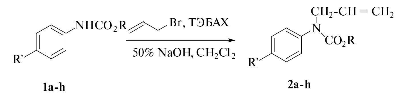 N-Аллилирование проводили при перемешивании на магнитной мешалке при 20°С смеси N-замещенных ароматических карбаматов, аллилбромида в метиленхлориде в присутствии 50%-ной водной щелочи и триэтилбензиламмония хлорида (ТЭБАХ) в качестве катализатора межфазного переноса, осуществляя мониторинг реакции с помощью ТСХ анализа. Установлено, что оптимальная продолжительность процесса составляет 7 ч.