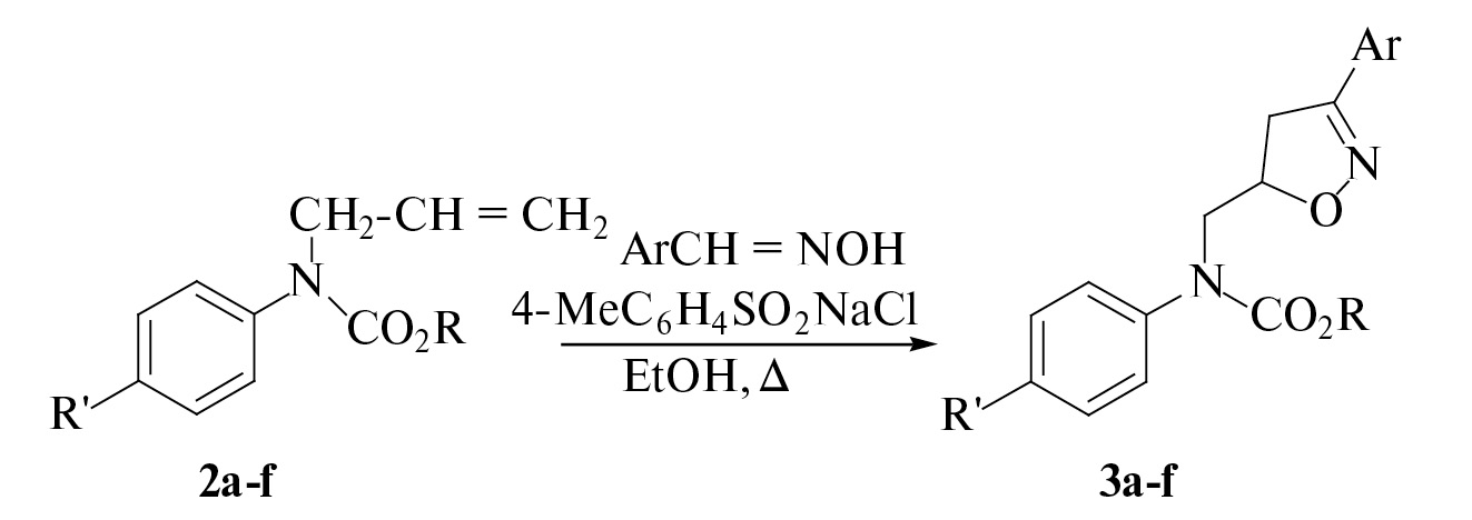 Алкилированием ароматических карбаматов аллилбромидом в условиях межфазного катализа в системе жидкость — жидкость (Ж-Ж) получены соответствующие N-аллильные производные арилкарбаматов с выходами 63–71%. Установлено, что циклоприсоединение N-оксидов аренкарбонитрилов, генерированных in situ из соответствующих оксимов в присутствии хлорамина Т, к аллильному фрагменту при кипячении в этаноле приводит к получению соответствующих производных 4,5-дигидроизоксазола с выходами 89–96%.