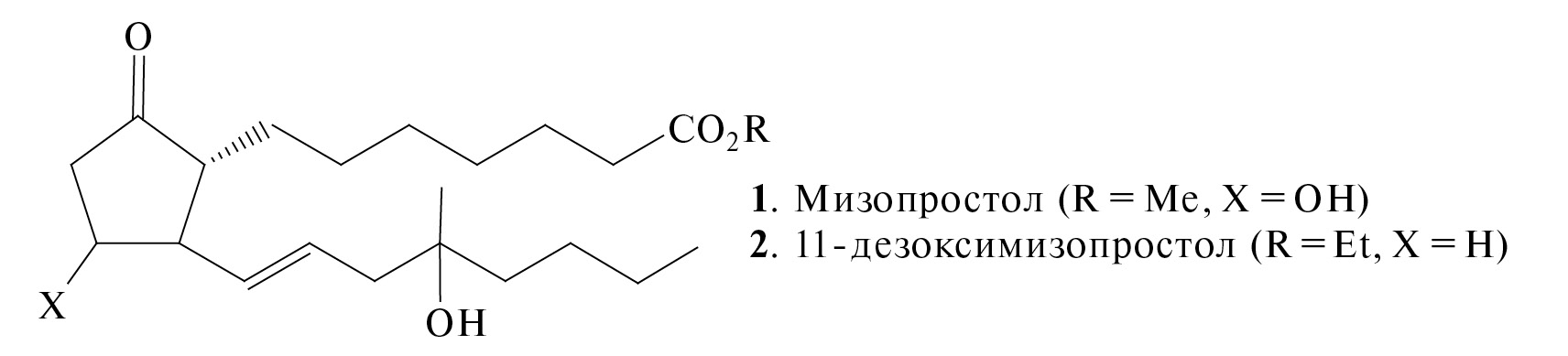 Однако мизопростол не лишен недостатков. Одним из “узких мест” при клиническом использовании мизопростола является химическая нестабильность и широта спектра физиологической активности [5]. В ходе поиска химически более стабильных и селективно действующих аналогов мизопростола ранее нами был синтезирован его 11-дезоксианалог 2, который проявил сопоставимую с мизопростолом специфическую утеротоническую активность при большей химической стабильности и меньшей токсичности [6]. Попытки повысить химическую стабильность молекулы мизопростола, уменьшить число побочных эффектов и поиск альтернативных возможностей его использования привели к синтезу ряда аналогов. Для выяснения закономерностей соотношения “структура–активность” изучено влияние строения боковых цепей: длины, отсутствия/наличия ненасыщенности (двойная или тройная связь), ее положения и геометрии (E/Z), положения и стереохимии заместителей в циклопентановом фрагменте молекулы, наличия/отсутствия заместителей и др.