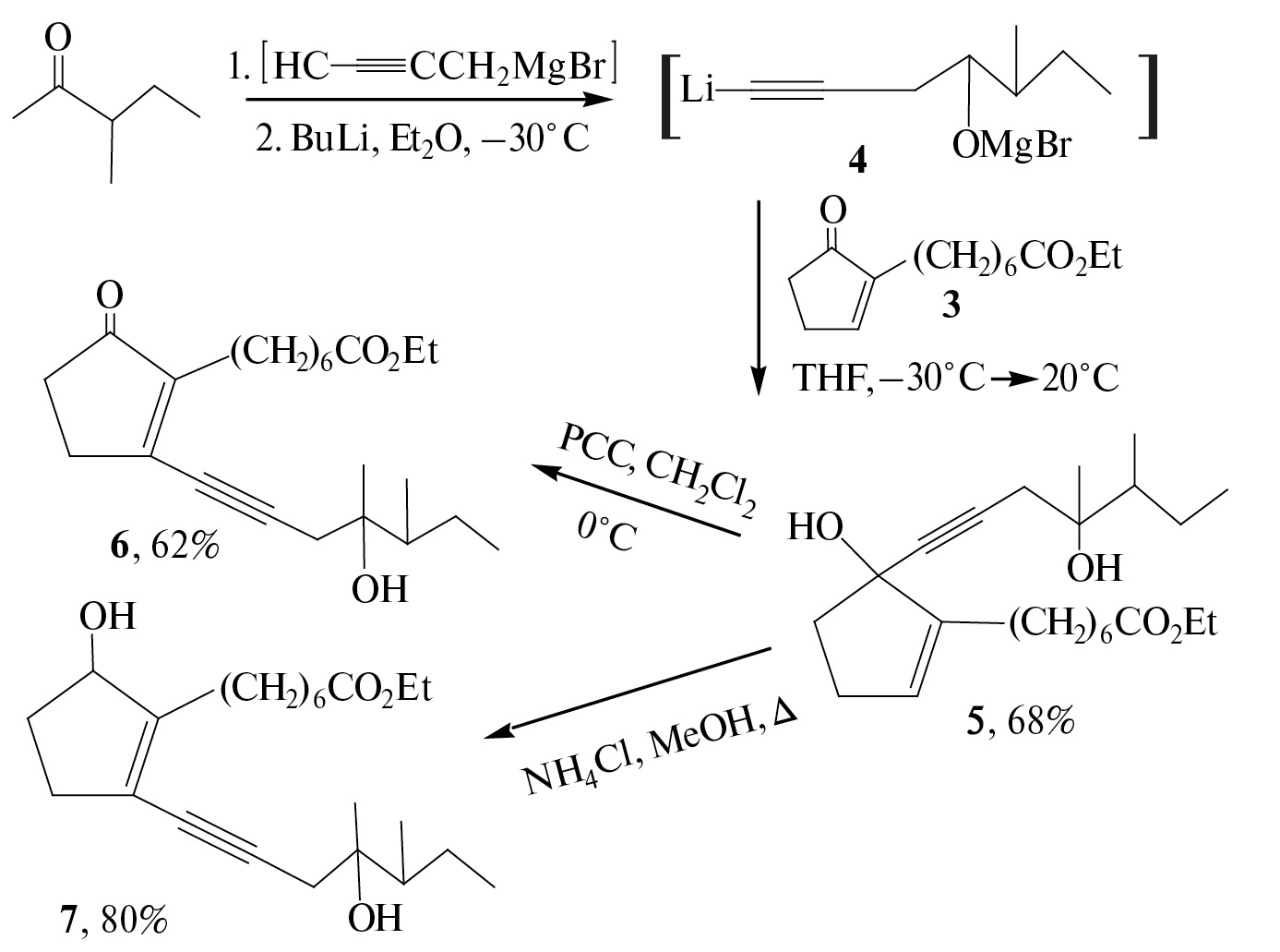 Модифицировав методику, а именно последовательным взаимодействием метилизобутилкетона с бромидом пропаргилмагния и далее с н-BuLi нам удалось in situ получить литийпроизводное 4, взаимодействие которого с циклопентеноном 3 дало желаемый аддукт 1,2-присоединения 5 в режиме one pot, минуя несколько стадий: выделения, защиты гидроксильной группы и очистки промежуточных продуктов. Последующая окислительная изомеризация соединения 5 с использованием PCC привела к целевому аналогу 6. Кипячением аддукта 1,2-присоединения 5 и NH4Cl в метаноле получен 20-нор-аналог 7.