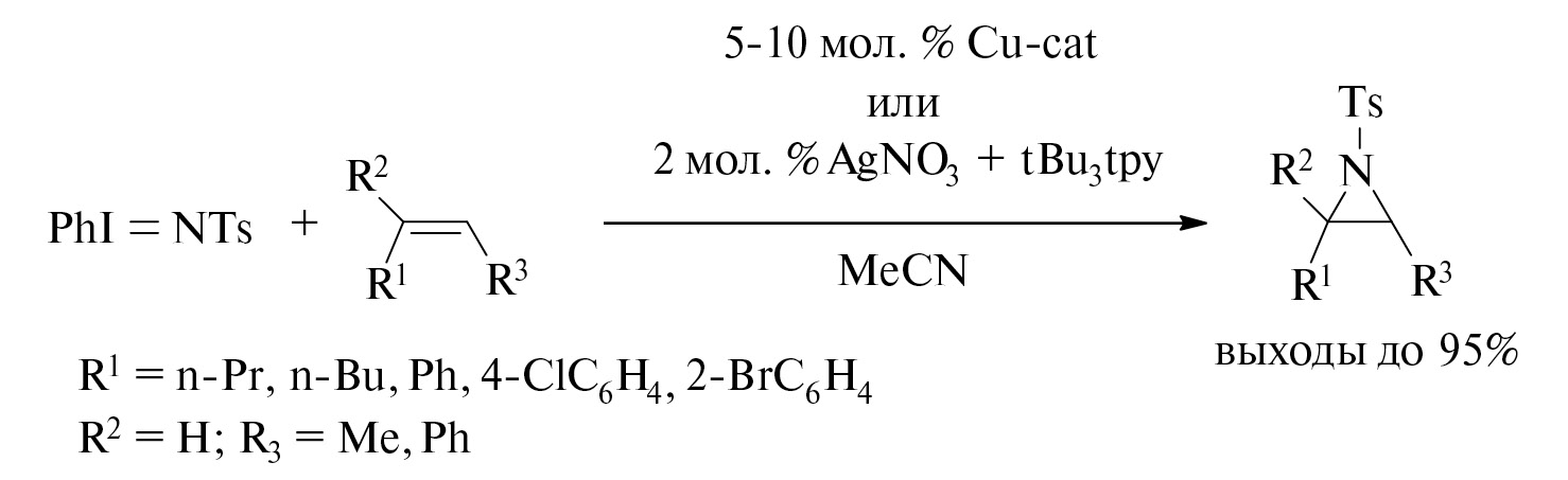 Химия азотсодержащих гетероциклических соединений активно развивается. Это связано с подобием структур природных молекул со структурами синтетических в фармацевтических субстанциях. Одним из способов получения гетероциклических соединений, в том числе и азиридинов, является окислительное присоединение N-нуклеофилов (в основном амидов карбоновых и сульфоновых кислот) к непредельным субстратам. Существует несколько подходов к реакциям аминирования и гетероциклизации соединений, содержащих кратные связи углерод–углерод. [1–16]. Для синтеза азиридиновых циклов существует метод, предполагающий получение нитренов из имино-λ3-йоданов. Например, реакции тозильного имино-λ3-йодана с алкенами в присутствии солей меди (I) [17] или меди (II) [18, 19], или комплексов на основе нитрата серебра и 4,4′,4′′-три-трет-бутил-2,2′:6′,2′′-терпиридина (схема 1) [20].