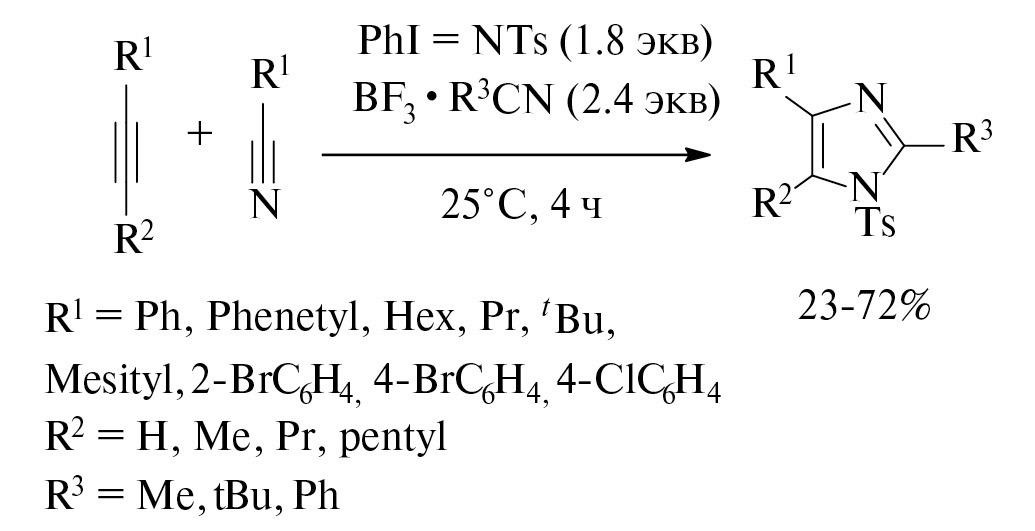 Рассмотрена возможность активировать замещенные ацетилены с образованием имидазолинов под действием N-сульфонилимино-λ3-йоданов в среде нитрилов в присутствии трифторида бора, образующего с растворителем нитрильные комплексы. Данную реакцию отличает отсутствие металлокомплексных катализаторов, мягкие условия протекания и высокая региоселективность (схема 2) [21].