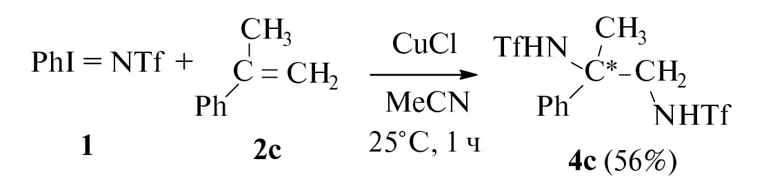 Ранее при использовании в качестве исходного субстрата α-метилстирола 2c в реакции с трифламидом в окислительных условиях были выделены 1-йод-2-фенилпропан-2-ол [26] и ацетамид [27]. В случае с PhI=NTf (1) в присутствии хлорида меди(I) реакция протекает по пути бис-трифламидирования субстрата с образованием N,N′-(2-фенилпропан-1,2-диил)бис(трифламида) 4c (схема 4). На это указывает наличие в ЯМР 1H спектре, помимо сигналов фенильного кольца в виде мультиплета при 7.5–7.3 м.д., 2 уширенных синглетов при 5.2 и 5.6 м.д., принадлежащих 2 NH-группам, и 2 дублетов при 3.7 и 3.6 м.д. с характеристичными значениями константы спин-спинового взаимодействия (КССВ) для протонов метиленовой группы, равными 14.2 Гц. В углеродном спектре наблюдаются сигналы при 63.8, 54.1, 23.8 м.д., что соответствует группам C–N, CH2N и CH3. Также, помимо основных сигналов, наблюдаются дополнительные сигналы в углеродном спектре при 60.8 м.д. (*С–N), 51.6 м.д. (*CH2N), 23.5 (*CH3) м.д. Наличие дополнительных сигналов можно объяснить асимметрией α-атома углерода продукта, который связан с 4 разными группами.