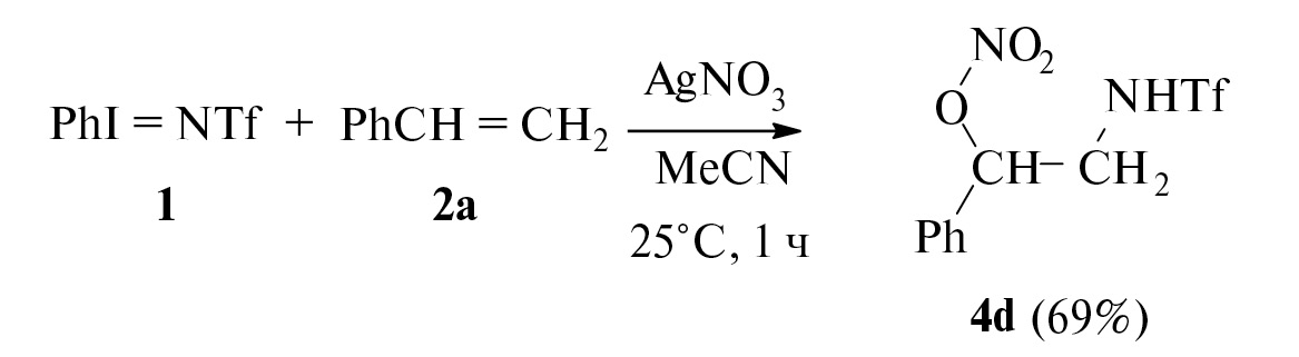 Реакция PhI=NTf (1) со стиролом 2 в присутствии нитрата серебра в качестве добавки приводит к неожиданному продукту раскрытия азиридинового кольца — 1-фенил-2-(трифламидо)этилнитрату 4d (схема 5).