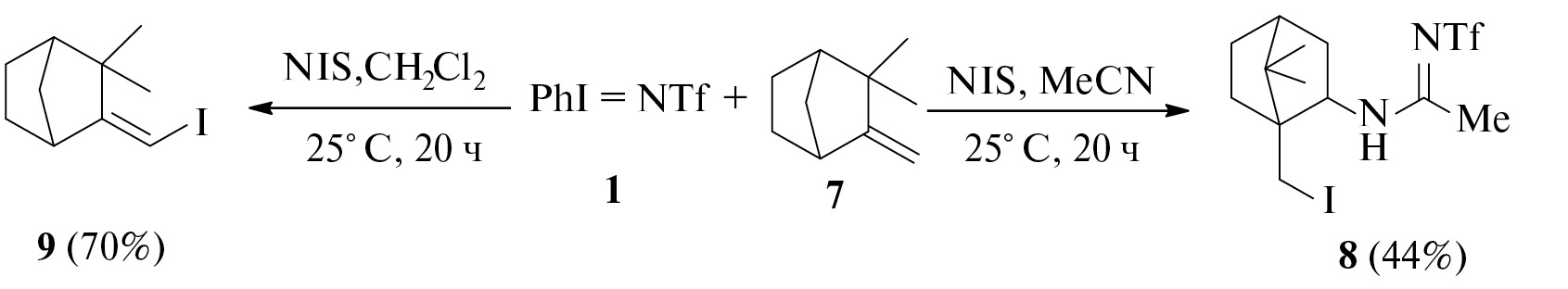 Замена растворителя на хлористый метилен в реакциях с окислителями на основе трехвалентного йода приводит к продукту 9 (выход 20%), который был выделен ранее в реакции камфена с PhI=NTf (1) в присутствии N-йодсукцинимида.