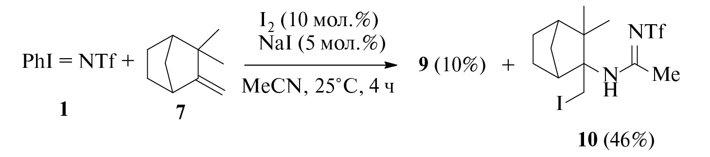 Ранее было показано, что реакция тозильного имино-λ3-йодана (PhI=NTs) со стиролом в присутствии каталитической добавки йода и йодида натрия в ацетонитриле приводит к целевому азиридину с хорошим выходом [31]. Вовлечение PhI=NTf (1) в реакцию в тех же условиях приводит к известному продукту бис-трифламидирования стирола [32]. При добавке йода и йодида натрия в реакции PhI=NTf (1) с камфеном, помимо соединения 9, выделили N-(2-(йодметил)-3,3-диметилбицикло[2.2.1]гептан-2-ил)-N′-(трифлил)ацетамидамид (10) (схема 8). На структуру соединения 10 указывает наличие в протонном спектре синглета при 5.9 м.д. NH группы, дублетов при 4.7 и 3.4 м.д. с J 9.8 Гц, характерных для CH2I фрагмента. Спектр 13С ЯМР содержит сигналы, помимо сигналов бициклического скелета, при 167.9, 51.8 и 11.2 м.д., что соответствует C=N, CNH и CH2I фрагментам.
