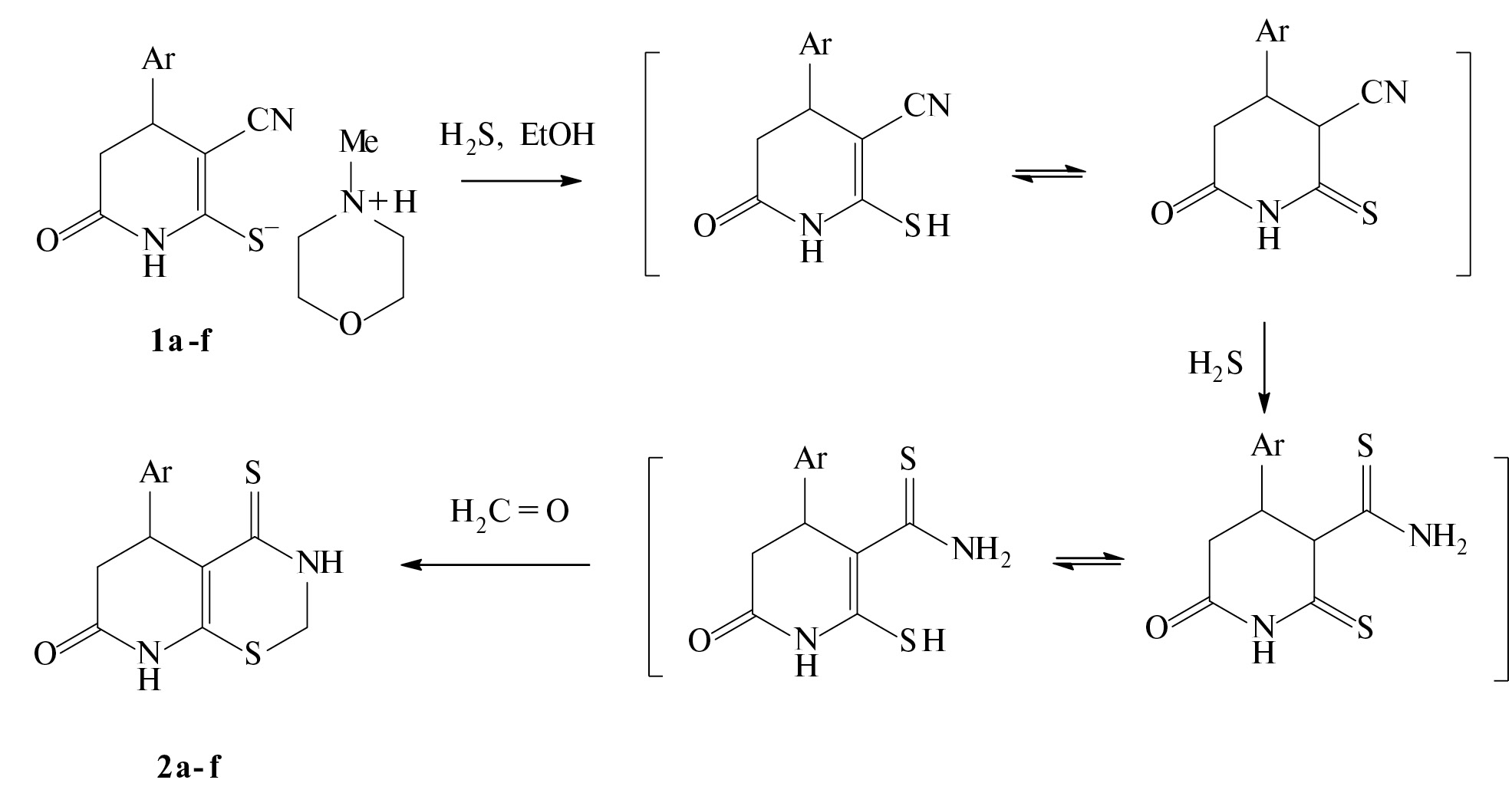 Вероятная схема этой реакции включает преобразование нитрильной группы под действием сероводорода в тиокарбамоильную, присоединение формальдегида к образовавшемуся аддукту с последующим формированием цикла 2,3-дигидро-4Н-1,3-тиазин-4-тиона.