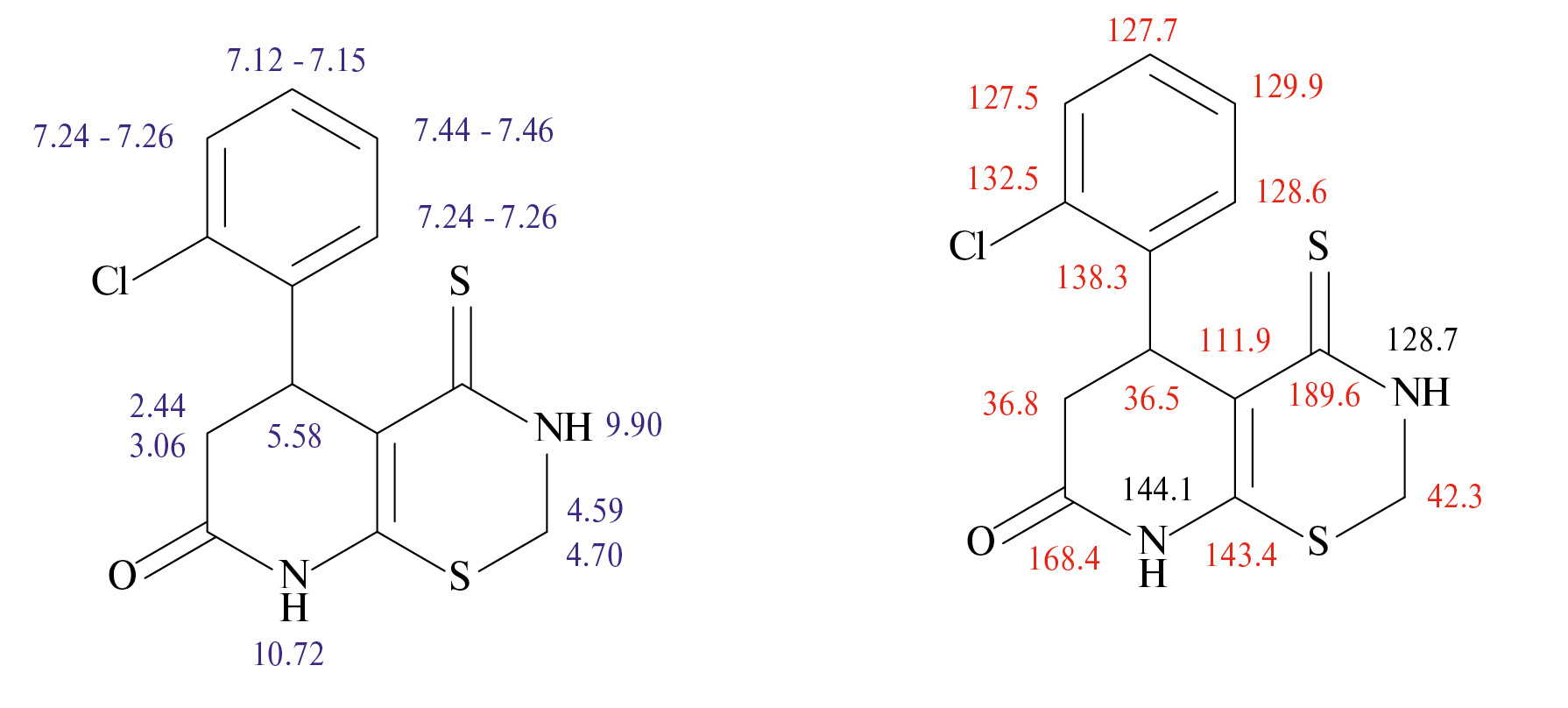4-Тиоксо-5-(2-хлорфенил)-2,3,4,5,6,8-гексагидро-7Н-пиридо[3,2-e][1, 3]тиазин-7-он (2а). Выход 1.119 г (72%), желтый мелкокристаллический порошок, т.пл. 225 °С (нач. разл.). ИК спектр, n, см-1: 3118 ш (2NH), 1695 (C=O). Спектр ЯМР 1Н, δ, м.д.: 2.44 уш.д (1Н, С(О)СН, 2JHH 16.4 Гц); 3.06 д.д (1Н, С(О)СН, 2JHH 16.4 Гц, 3JHH 8.0 Гц); 4.59 д.д (1Н, NHCH, 2JHH 12.5 Гц, 3JHH 5.9 Гц); 4.70 д.д (1Н, NHCH, 2JHH 12.5 Гц, 3JHH 3.3 Гц); 5.58 уш.д (1Н, С5Н, 3JHH 8.0 Гц); 7.12–7.15 м (1Н, С4Н Ar); 7.24–7.26 м (2Н, C3H Ar и C6H Ar); 7.44–7.46 м (1H, C5H Ar); 9.90 уш.д.д (1Н, C(S)NH, 3JHH 3.3 Гц, 3JHH 5.9 Гц); 10.72 c (1H, C(O)NH). Спектр ЯМР 13С (DEPTQ), δ, м.д.: 36.5* (C5H), 36.8 (CC=O), 42.3 (SCH2), 111.9 (CC=S), 127.5* (C3H, Ar), 127.7* (C4H, Ar), 128.6* (C6H, Ar), 129.9* (C5H, Ar), 132.5 (CCl), 138.3 (C1, Ar), 143.4 (NHCS), 168.4 (C=O), 189.6 (C=S). * Сигналы — в противофазе. Масс-спектр (HRMS, ESI-TOF), m/z: 332.9616 [M — H + Na]+, 354.9461 [M — 2H + 2Na]+ C13H11ClN2OS2. M — H + Na 332.8041, M — 2H + 2Na 354.7859.