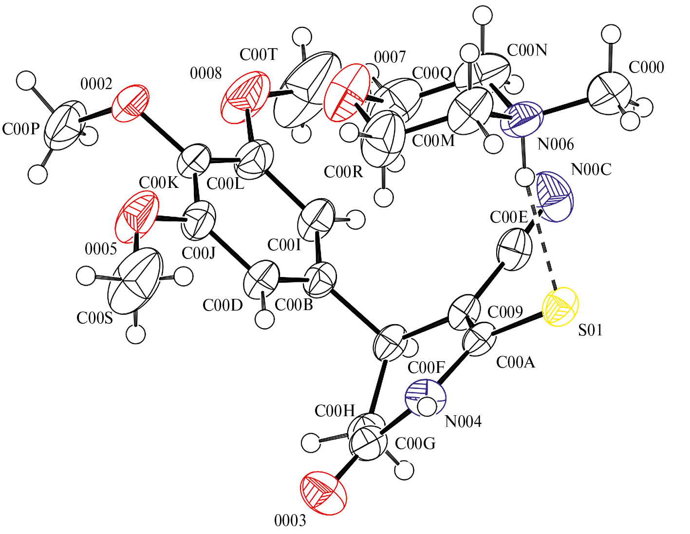 При взаимодействии N-метилморфолиния 4-арил-2-оксо-5-циано-1,2,3,4-тетрагидропиридин-6-тиолатов с сероводородом и формальдегидом в этаноле получены 5-арил-4-тиоксо-2,3,4,5,6,8-гексагидро-7Н-пиридо[3,2-e][1,3]тиазин-7-оны. Молекулярная и кристаллическая структуры N-метилморфолиния 4-(3,4,5-триметоксифенил)-2-оксо-5-циано-1,2,3,4-тетрагидропиридин-6-тиолата изучены с помощью метода РСА.
