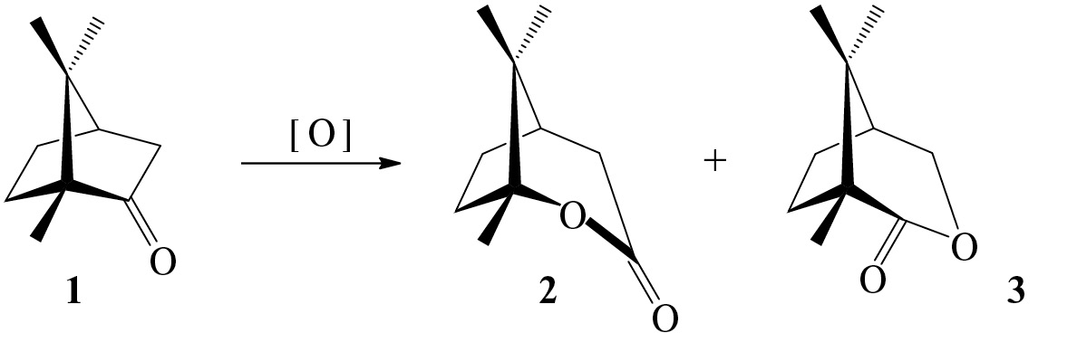 Реакция окисления по Байеру–Виллигеру кетонов в сложные эфиры, включая лактоны, широко используется в органическом синтезе. В литературе имеется несколько примеров окисления бициклического монотерпенового кетона — R-(+)-камфоры (1), содержащейся в масле камфорного лавра Cinnamonum camphora (до 75%) [1]. При окислении кетона 1 органическими надкислотами образуется смесь 1,2- (2) и 3,4- (3) камфолактонов (схема 1) в различных соотношениях, которые уже нашли применение в органическом синтезе в качестве субстратов [2–5] и вспомогательных хиральных соединений [6–8].