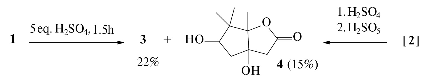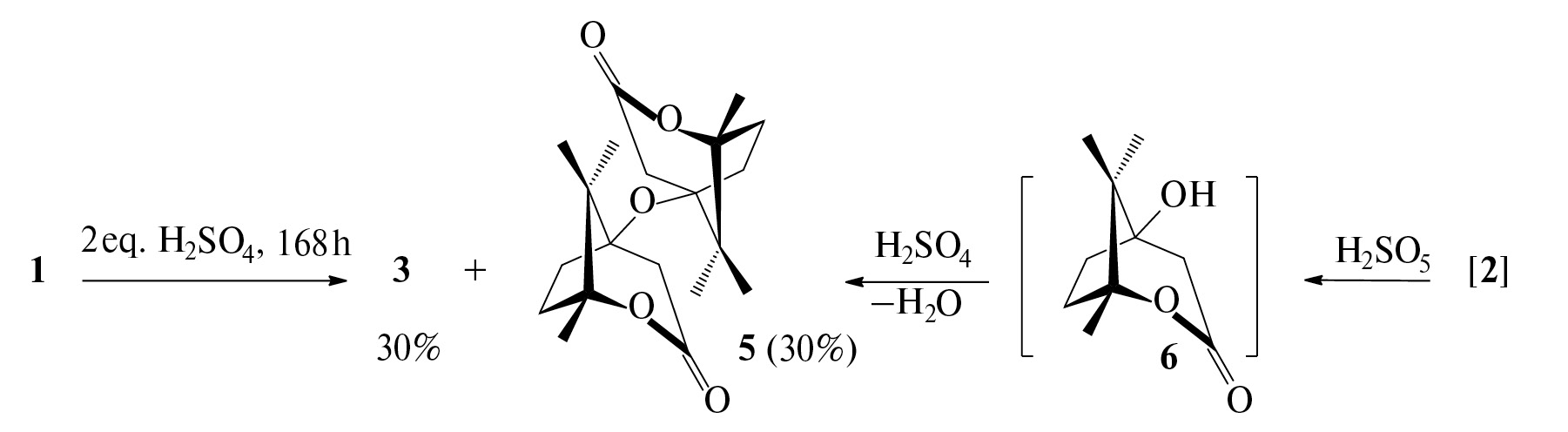 Недорогим и доступным реагентом для окисления камфоры 1 представляется кислота Каро (мононадсерная кислота). Однако поведение камфоры в этой реакции неоднозначно. Впервые 5-ю эквивалентами мононадсерной кислоты 1 эквивалент камфоры 1 окисляли А. Байер и В. Виллигер [14 при комнатной температуре в течение 1.5 ч, в результате реакции образовалась смесь α-камфолида 3 (22%) и пентанолида 4 (15%) (схема 2). В дальнейшем установлено [15] строение пентанолида 4 как продукта последовательных реакций кислотной перегруппировки и окисления промежуточного β-камфолида 2.