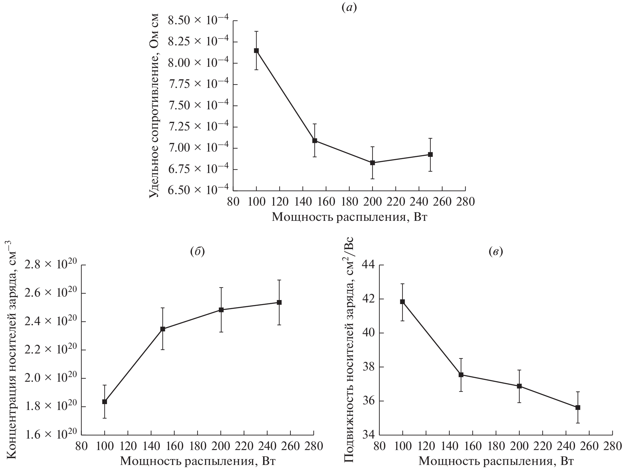 Magnetron sputtering in the medium frequency (MF) mode was used to obtain ITO films on glass substrates at room temperature in an oxygen-free environment. The effect of the magnetron sputtering power on the electrophysical properties and surface morphology of ITO films is studied. It is shown that the ITO film deposition rate depends linearly on the power of magnetron sputtering in the MF mode. It is found that ITO films have a predominantly nanocrystalline structure at a magnetron sputtering power of more than 100 W. Increasing the sputtering power leads to an increase in surface roughness from 13.5 to 24.6 nm and grain size from 11.7 to 27.5 nm in the ITO film. The minimum resistivity of the ITO films is 6.82 × 10–4 Ω cm at the concentration and mobility of charge carriers of 2.48 × 1020 cm–3 and 36.8 cm2/V s, which corresponds to the optimum power of magnetron sputtering of 200 W. The results obtained correspond to a high level of surface resistance values for ITO films (34.1 Ω/□), which can be used to form transparent conducting electrodes in solar cells and memristors, both on glass and flexible substrates.