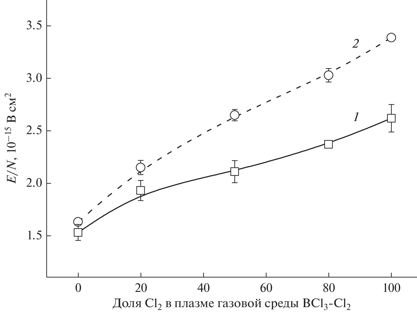 Проведены зондовые и спектральные измерения плазмы газовой среды BCl3–Cl2. Получены данные по влиянию начального состава газовой среды на напряженность электрического поля, температуру газа, концентрацию частиц, приведенную напряженности электрического поля в условиях тлеющего разряда постоянного тока. Проанализированы спектры излучения плазмы газовой среды BCl3–Cl2, идентифицированы основные излучающих компонентов и установлены взаимосвязи между интенсивностями излучения и концентрациями частиц.