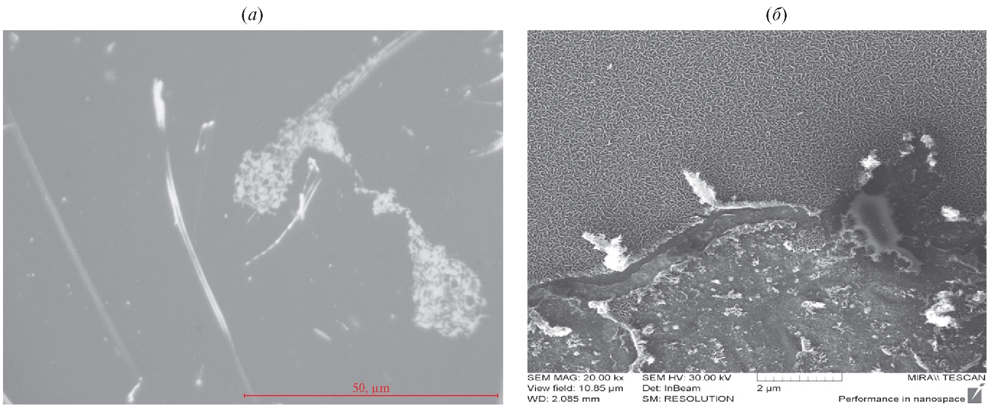 Рис. 3. Оптическая микроскопия области первоначального пробоя (а) и электронная микроскопия участка первоначального пробоя с фокусировкой на поверхностных образованиях (б). Образец с сопротивлением 230 кОм.